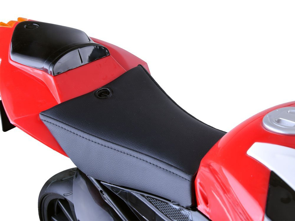 Wenn du fährst, leuchtet das Fahrrad auf, es gibt Tasten am Lenkrad, unter denen die Hupe ertönt und der Motor läuft.Wie es sich für ein Rennmotorrad gehört, befinden sich auf dem Armaturenbrett eine Uhr, ein Tachometer und ein Drehzahlmesser (Aufkleber).