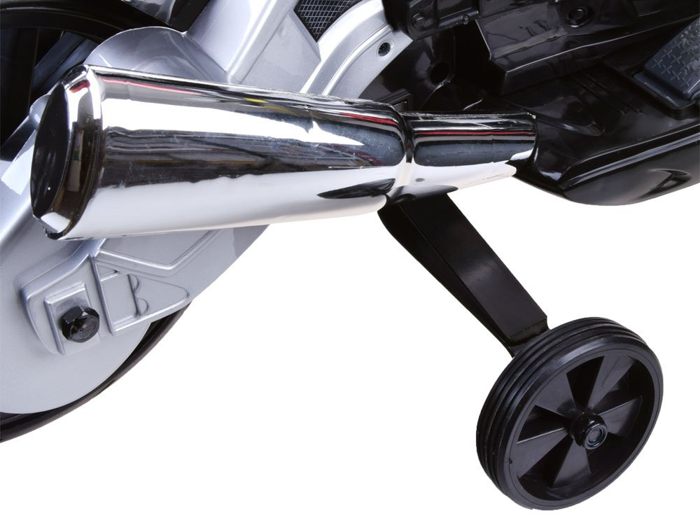 Eine erstaunliche Eigenschaft des Fahrzeugs ist, dass die seitlichen Räder angezogen werden können, so dass das Kind die Fahrt leicht bewältigen kann.