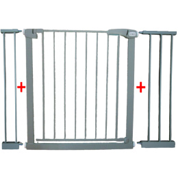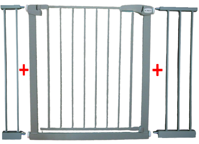 Wymiary: wysokość: 78 cm, szerokość bramki z rozszerzeniami  (bez śrub) - 102 cm otwór montażowy: 79-115 cm otwór montażowy z rozszerzeniami: 110-115 cm minimalna szerokość otworu montażowego (bramka ze śrubami) - 79 cm, minimalna szerokość otworu montażowego (bramka ze śrubami) z rozszerzeniami - 110 cm, maksymalna szerokość otworu montażowego (bramka ze śrubami) - 115 cm szerokość elementów rozszerzających: 10,5 cm oraz 20,5 (dwa elementy) ilość elementów rozszerzających: 2 wysokość drzwi: 71,5 cm, szerokość drzwi: ok. 58 cm, 4 śruby montażowe z silikonowymi nakładkami, waga: 5,5/6 kg, Dzięki możliwości rozbudowania i systemowi montowania bramkę można dopasować do przejść o wymiarach od 79 cm do 115 cm. Rozszerzenia możesz zamontować po dowolnej stronie. Możesz zamontować jedno rozszerzenie lub  nie montować żadnego.