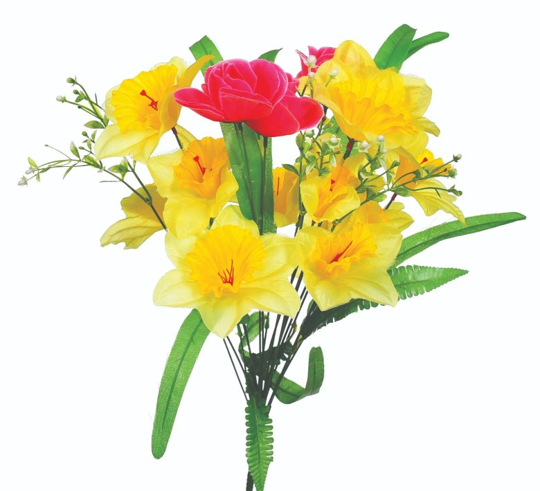 Bukiet o wysokości 54 cm składa się z delikatnych kwiatów w odcieniach żółci i różu, które zachwycają swoją naturalnością. Wyjątkowe detale, takie jak starannie odwzorowane liście, nadają kompozycji pełni życia i realizmu. Doskonały wybór do dekoracji w domu, biurze czy na specjalne okazje.