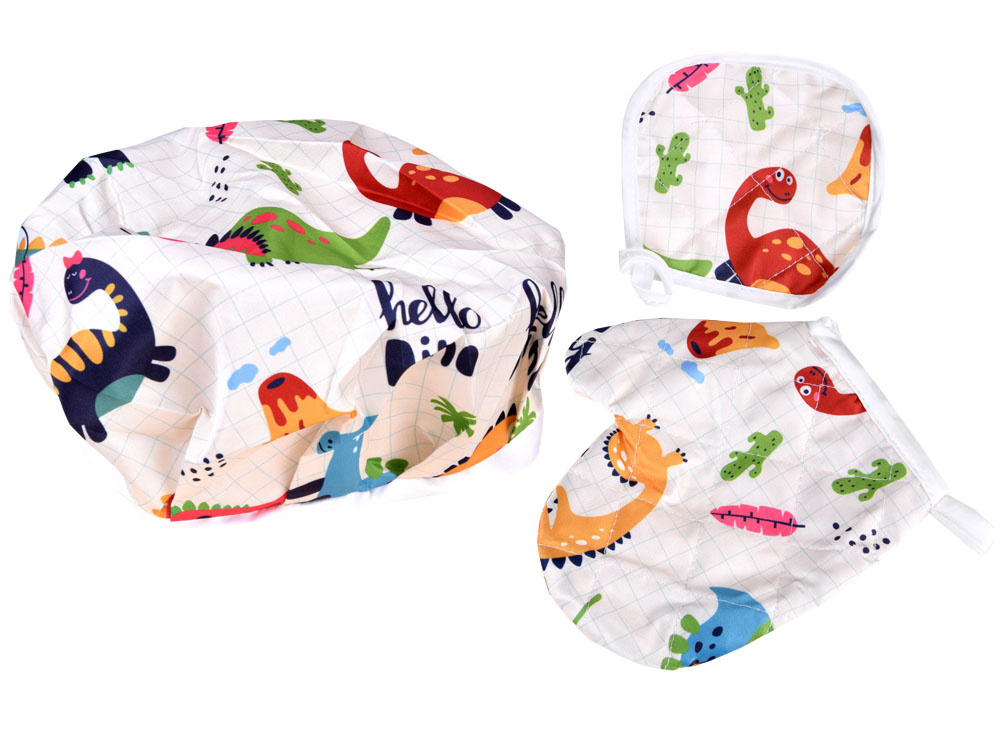 Das Set aus Stoff mit niedlicher Dinosauriergrafik wird die Gunst eines jeden Kochs gewinnen.