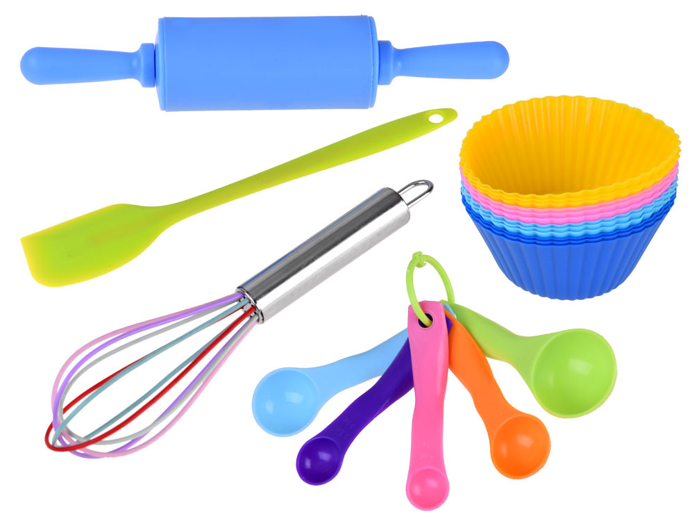 schürze - Kochmütze - Kochhandschuh - Stoffmatte - Teigroller - Metallschneebesen - Pfannenwender - Messlöffelset - 8 Kuchenformen in Form von min.