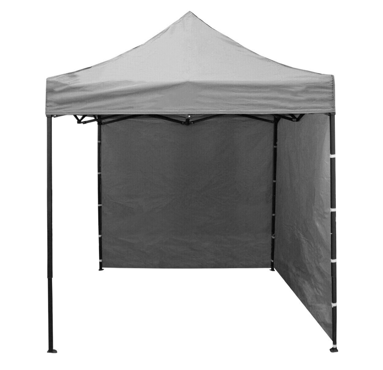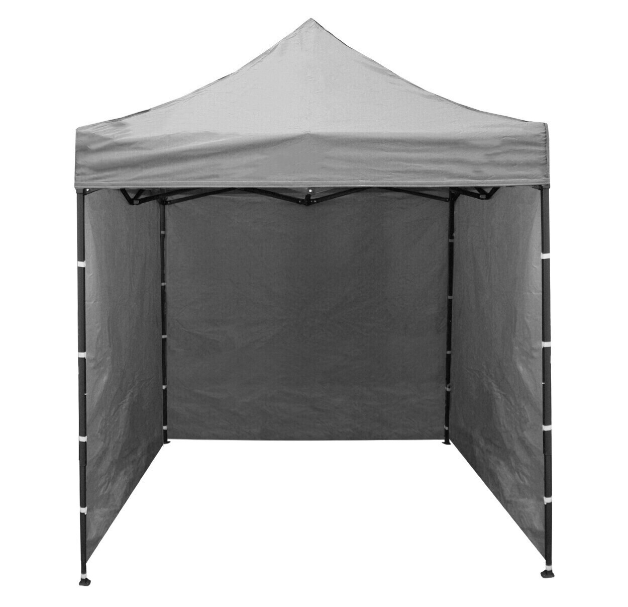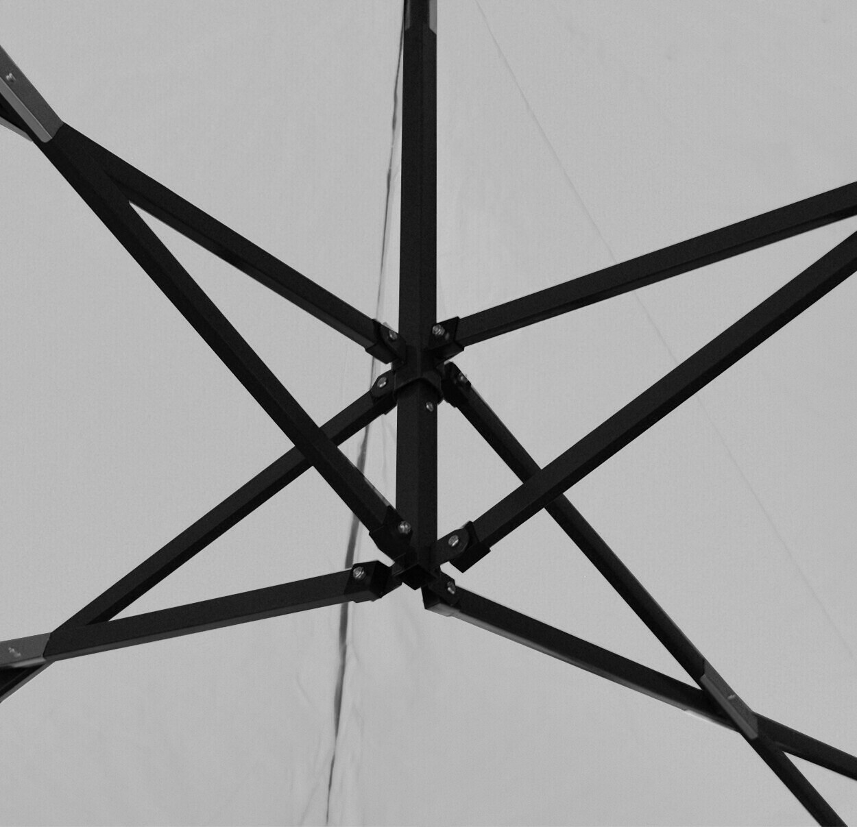 Verkaufsstand mit schnell aufklappbarer Scherenkonstruktion, ausgestattet mit drei abnehmbaren Seitenwänden, die mit Klettverschluss befestigt sind, und einer dreistufigen Höhenverstellung.