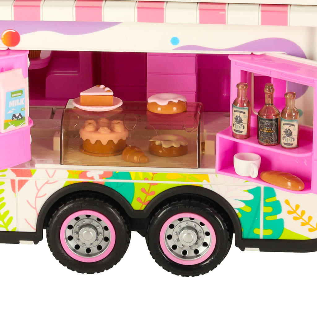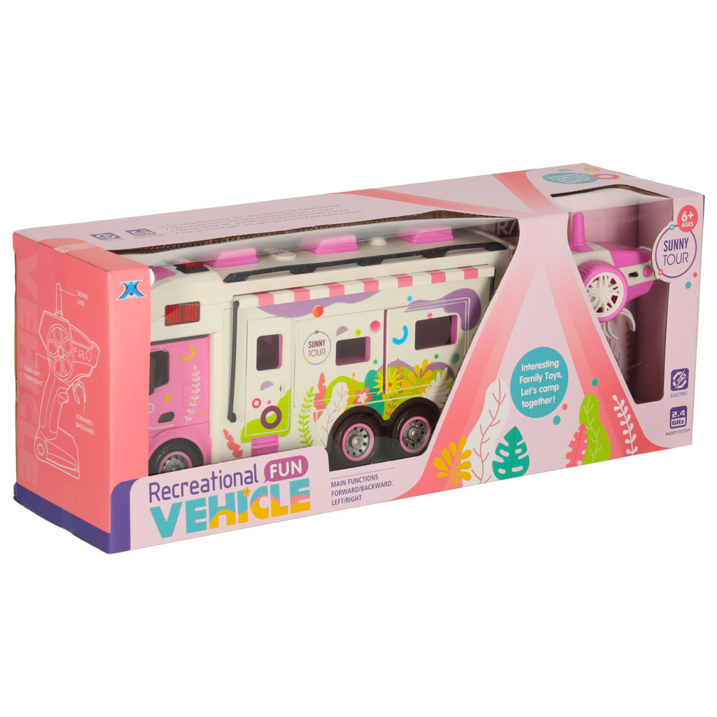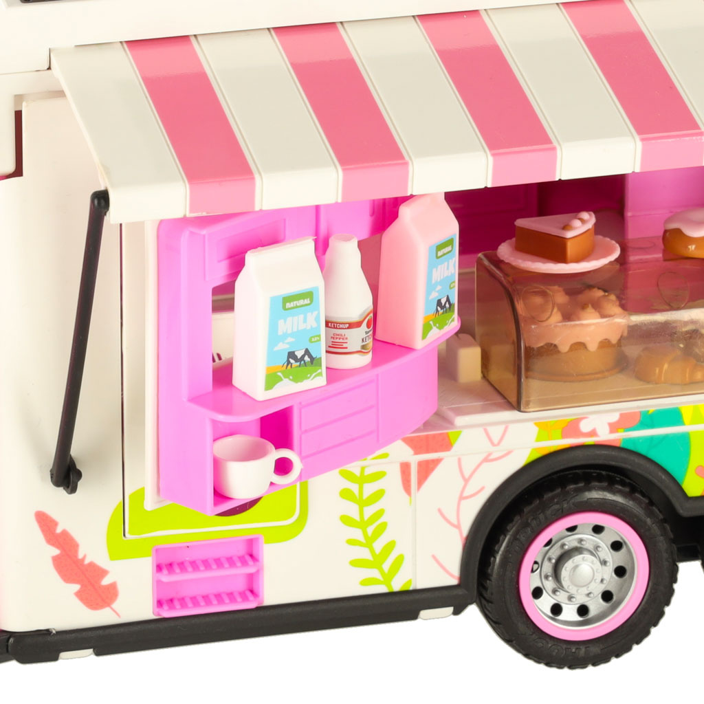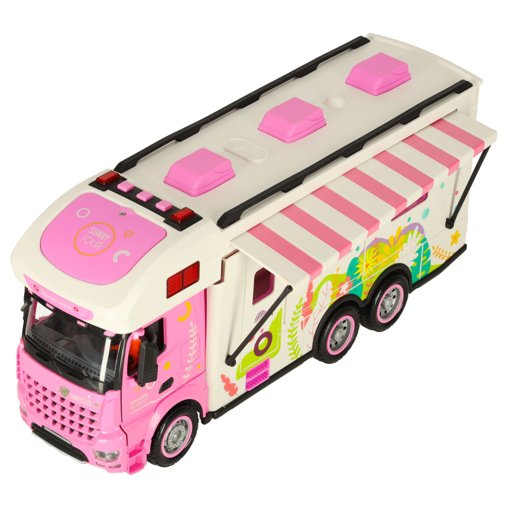 barva: bílá s prvky růžové - barevné květinové motivy na bocích obytného vozu