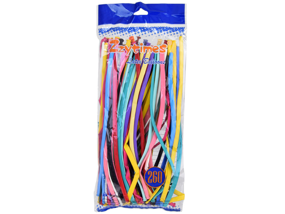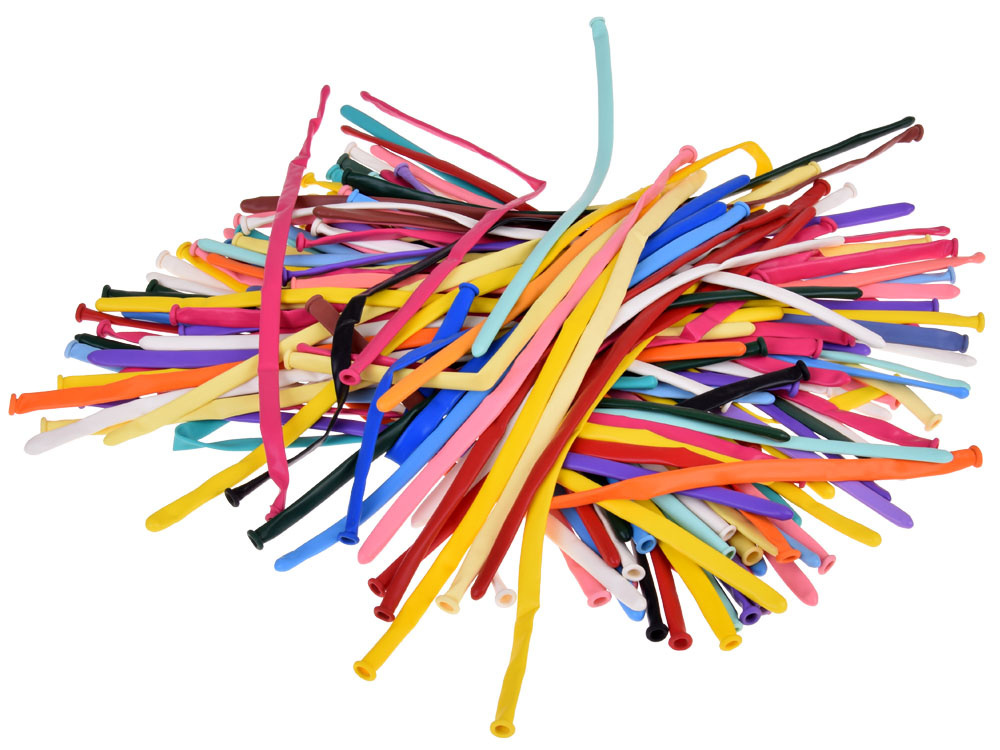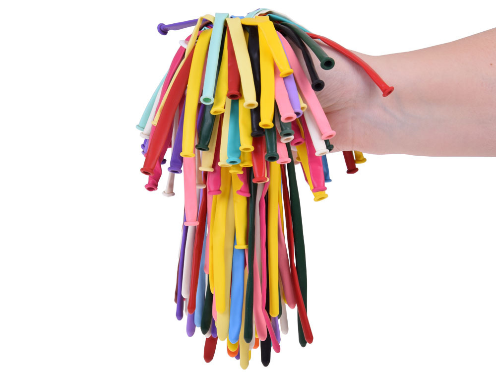 W zestawie znajduje się100 balonów w różnych, żywych kolorach, zapakowane fabrycznie. Przed napompowaniem ich długość to ok 30cm, co pozwali stworzyć swoje własne kompozycje dekoracyjne np kwiatki, pieski misie co wyobraźnia przyniesie do głowy i zdolności manualne pozwolą.