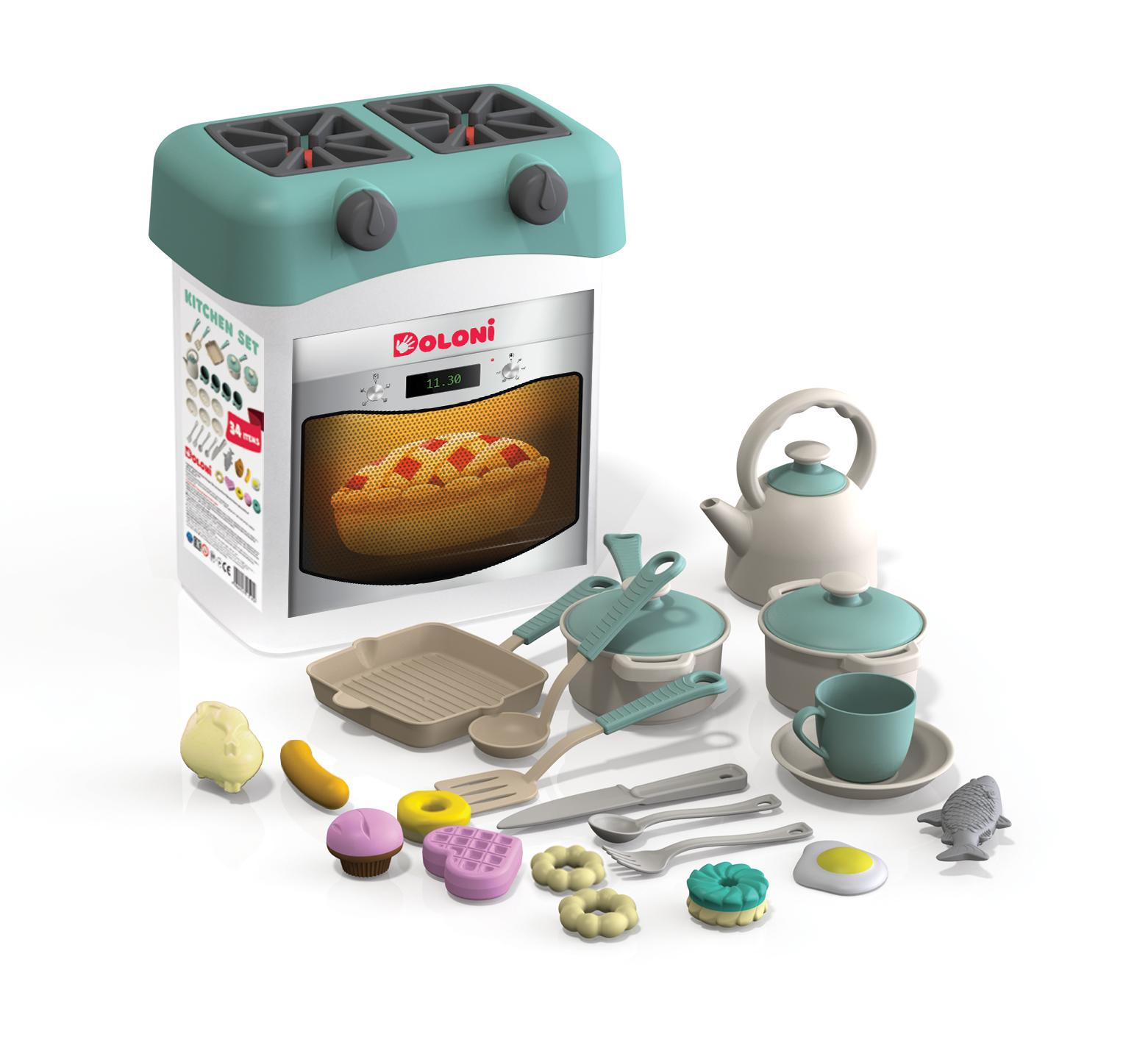 Doloni Plastikkinderküche, Spielküche mit Kochherd, Koch Pretend-Spielset mit 34-teiligem Spielzeug Nahrungs- und Kochgeschirr Zubehör, Türkis