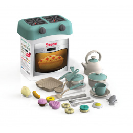 Dieses Modell der Kinderküche ist mit 34 Zubehörteilen ausgestattet - Teekanne mit Deckel, 6x Teller, 4x Glas, 2x Gabel, 2x Löffel, Messer, Schöpflöffel, Spatel, Kasserolle mit Griff und Deckel, Topf mit Deckel, Pfanne, Wurst, Fisch, Rührei, Huhn und 5x Keks.