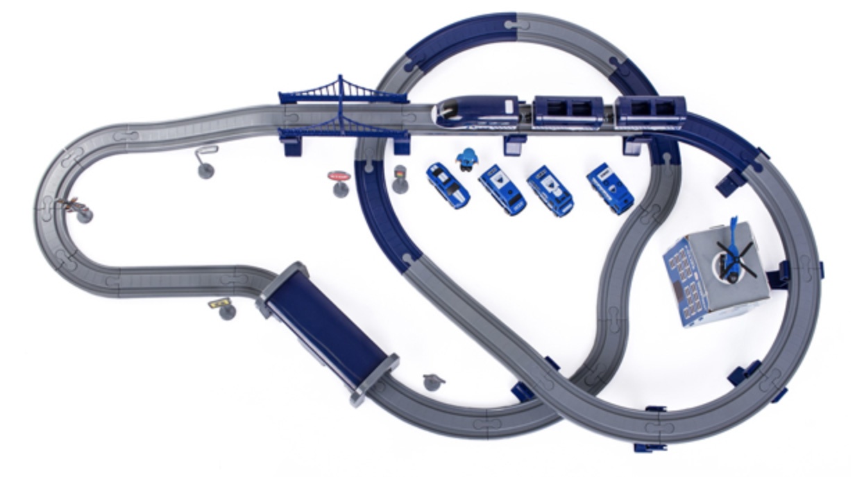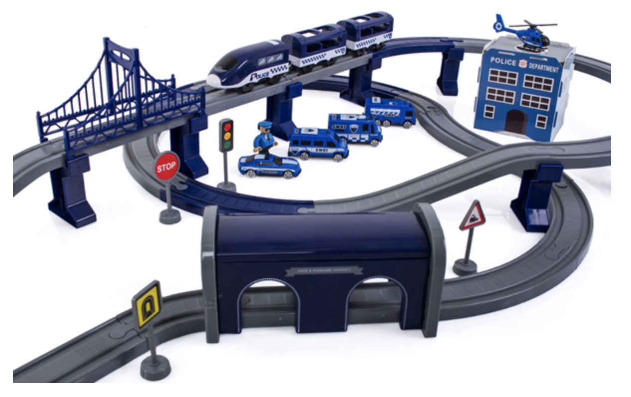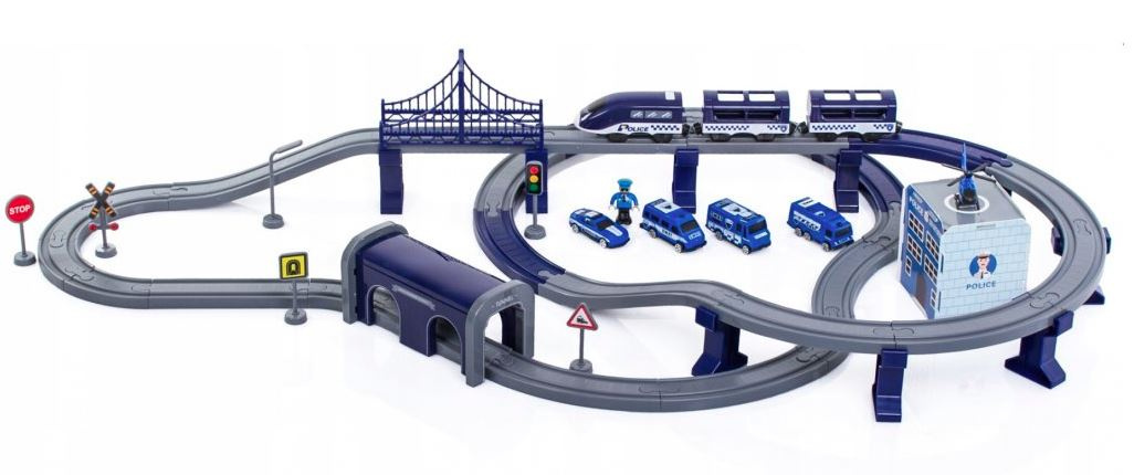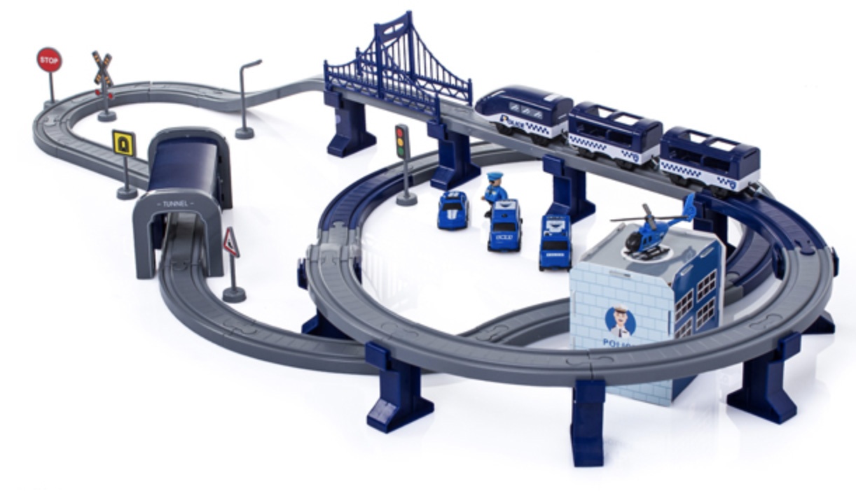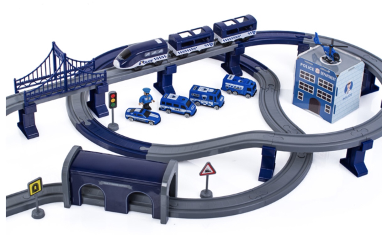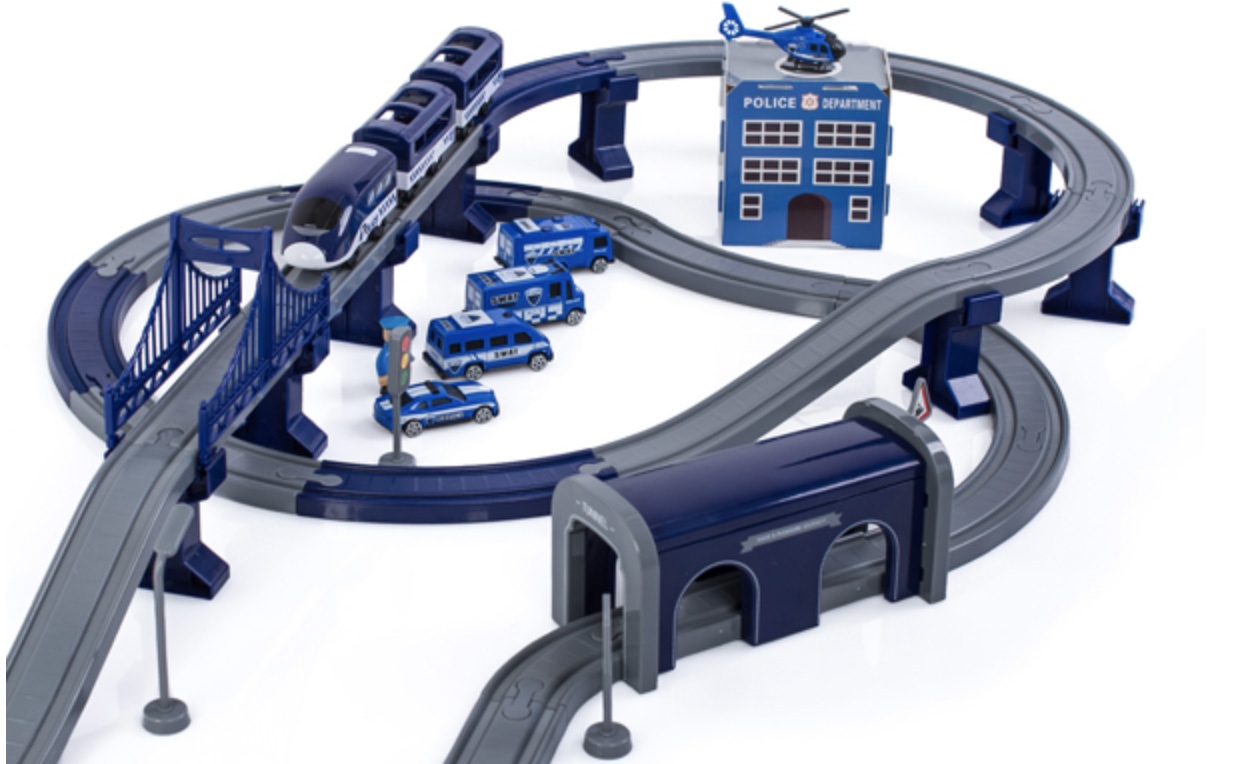 Die 2in1-Zugstrecke ist eine Kombination aus einer Zugstrecke und einer Polizeistation.Eisenbahnstrecke mit reichhaltigem Zubehör von Aga4Kids.