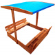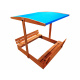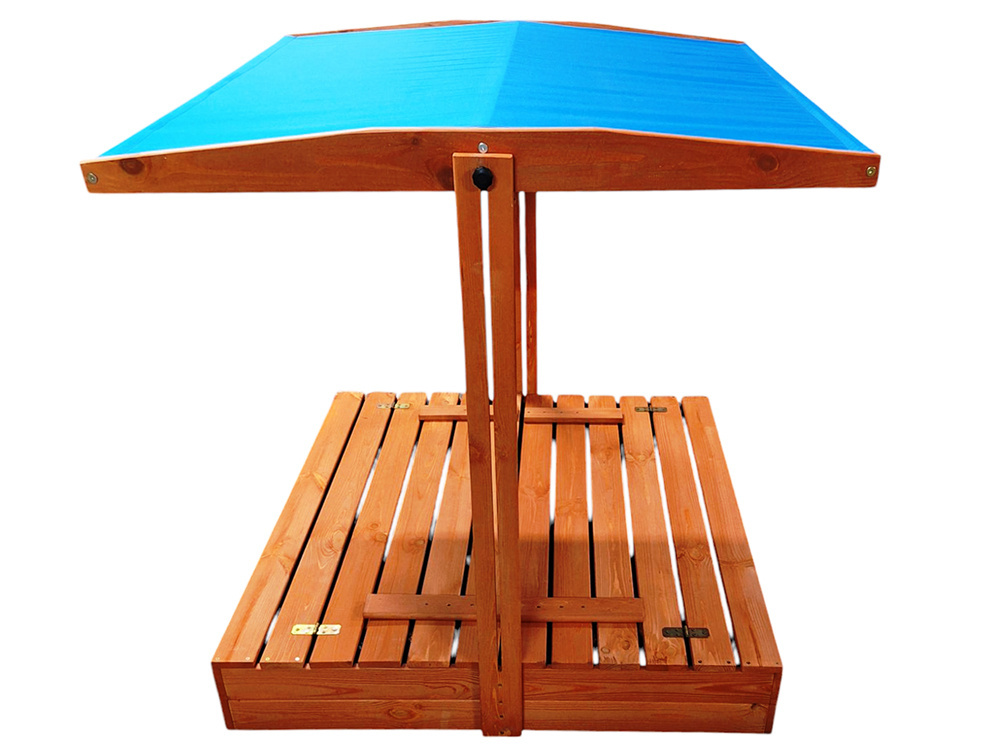 Drewniana piaskownica z daszkiem chroniącym dziecko przed słońcem, który można po zakończonej zabawie można opuścić, aby chronił piasek przed zwierzętami, liśćmi itp.