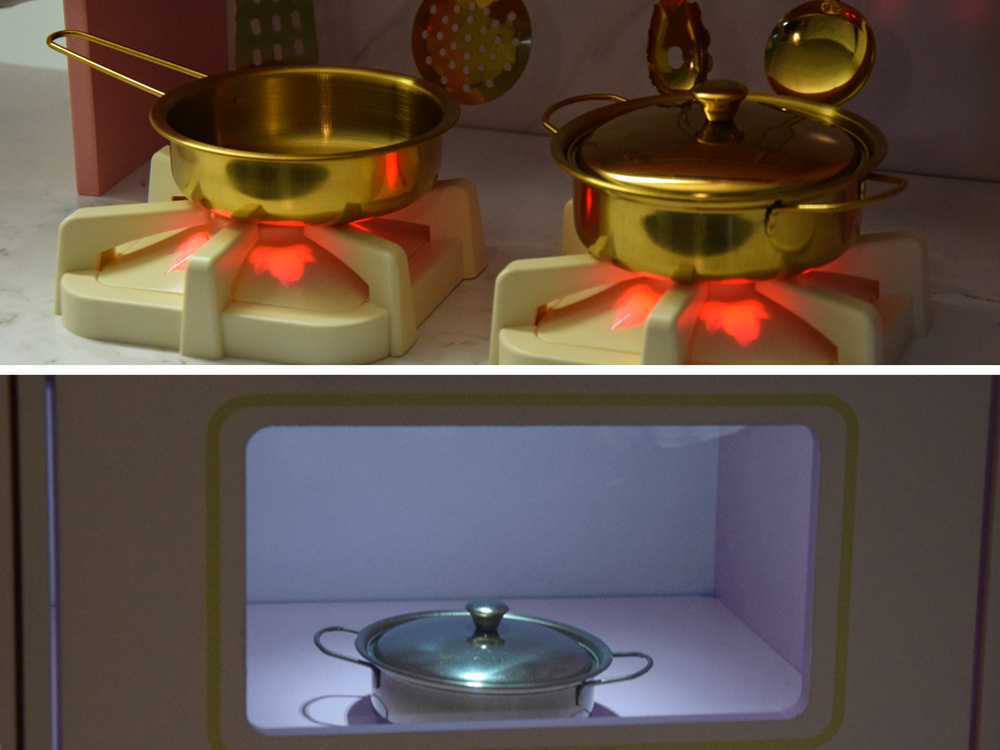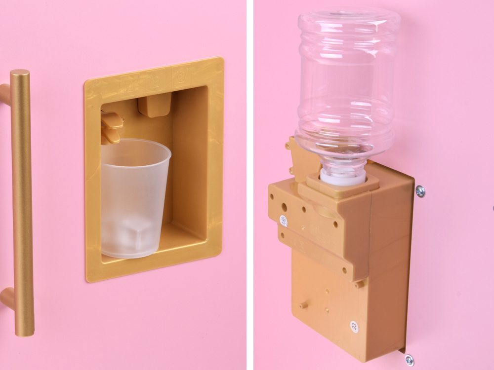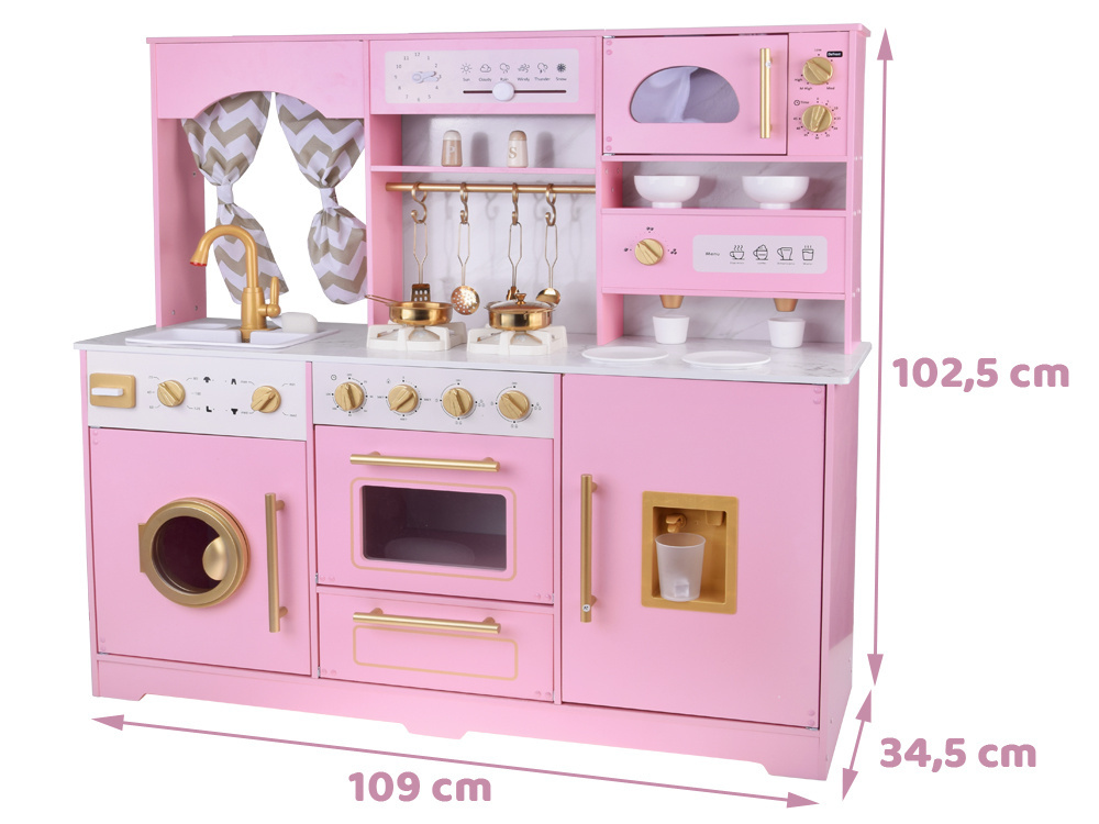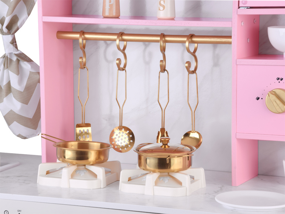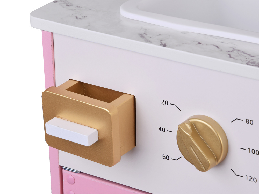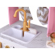 W kuchni wykorzystano uroczy odcień różu, "marmur" oraz złote dodatki. Połączenie to wygląda niezwykle stylowo i efektownie. Ta kuchnia jest stworzona dla każdego, kto ceni sobie wysoką estetykę i wysoką jakość wykonania. Kuchnia pięknie będzie się prezentować w każdym dziecięcym pokoju. Dodatkowo funkcje interaktywne sprawią, że zabawa będzie jeszcze bardziej interesująca! Z taką kuchnią łatwo wczuć się w rolę gospodyni, pani domu czy szefowej kuchni w eleganckiej restauracji. W takiej kuchni przygotowanie posiłków i przyjęć dla lal i misiów będzie prawdziwą przyjemnością!