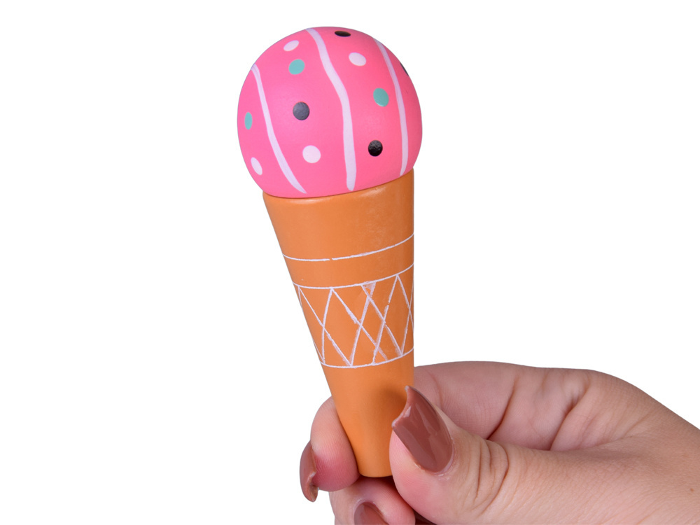 Lody w rożkach i pucharkach są mocowane za pomocą wystających patyczków, co umożliwia ich stabilne łączenie i łatwe wyjmowanie.