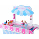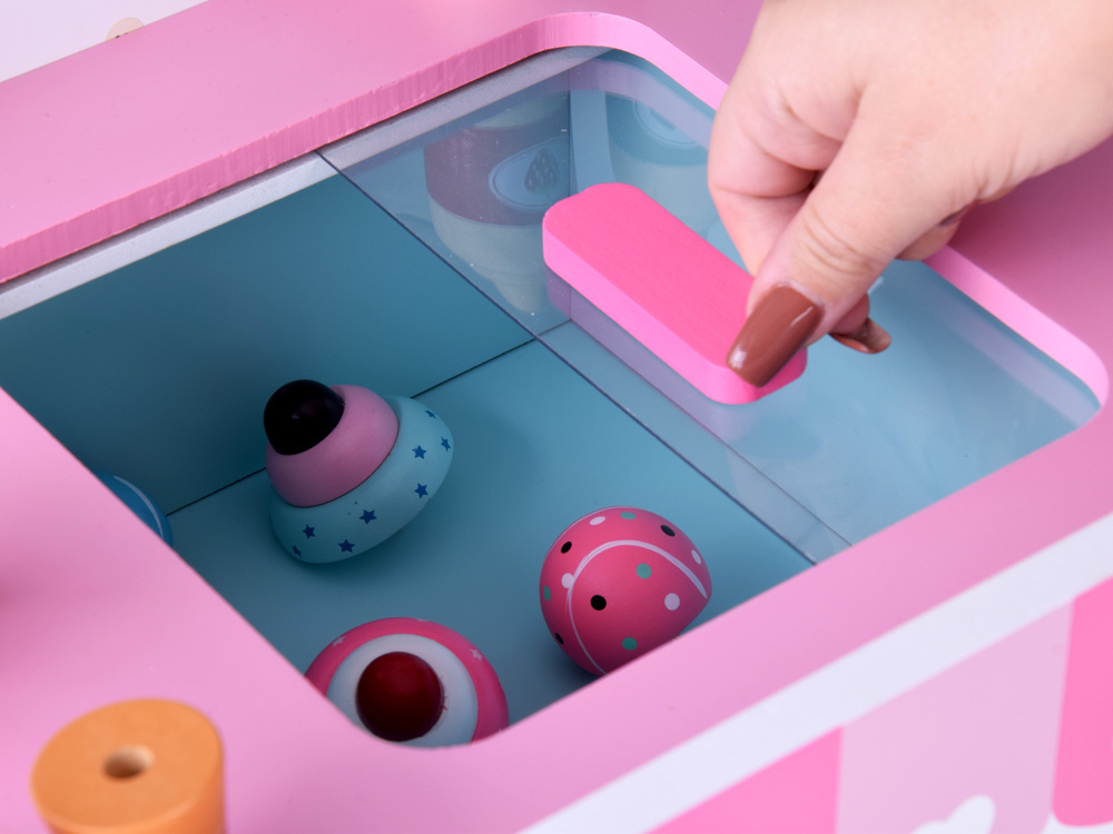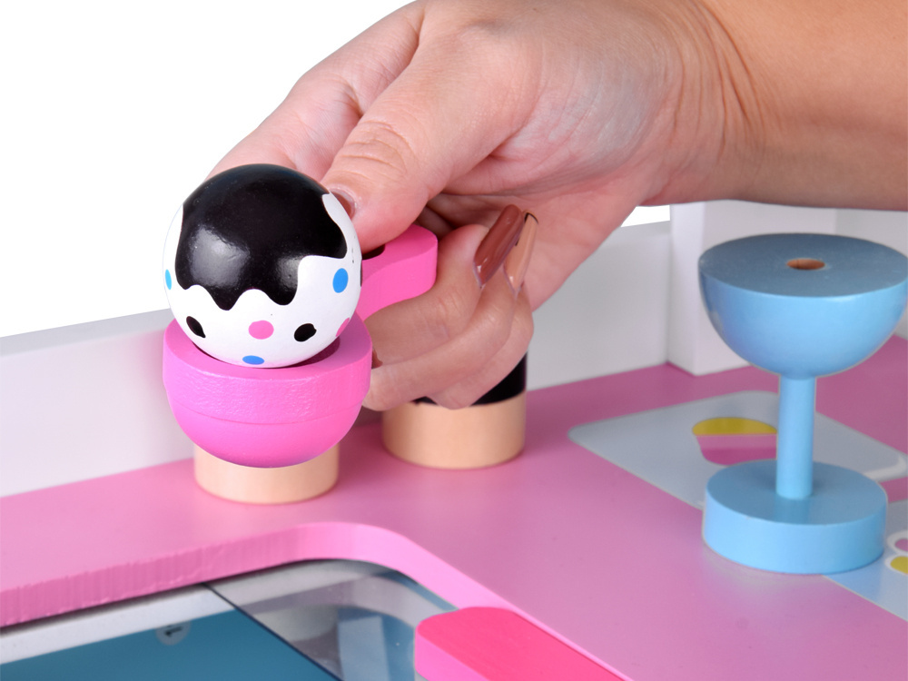 Pod nią umieszczono dużą półkę, na której można przechowywać wszystkie zabawkowe akcesoria cukiernicze, a także zasuwane pomieszczenie typu “chłodnia”, służące do przechowywania lodów