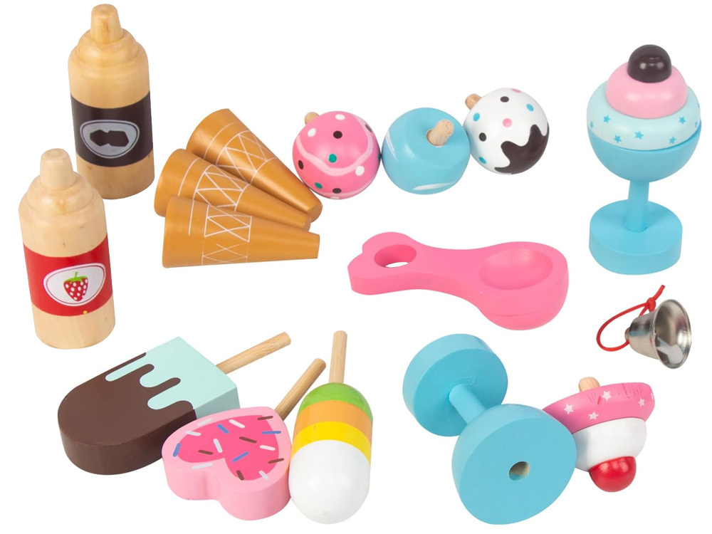 W zestawie znajduje się bogaty wybór elementów, które pozwolą na kreatywną zabawę w lodziarnię: