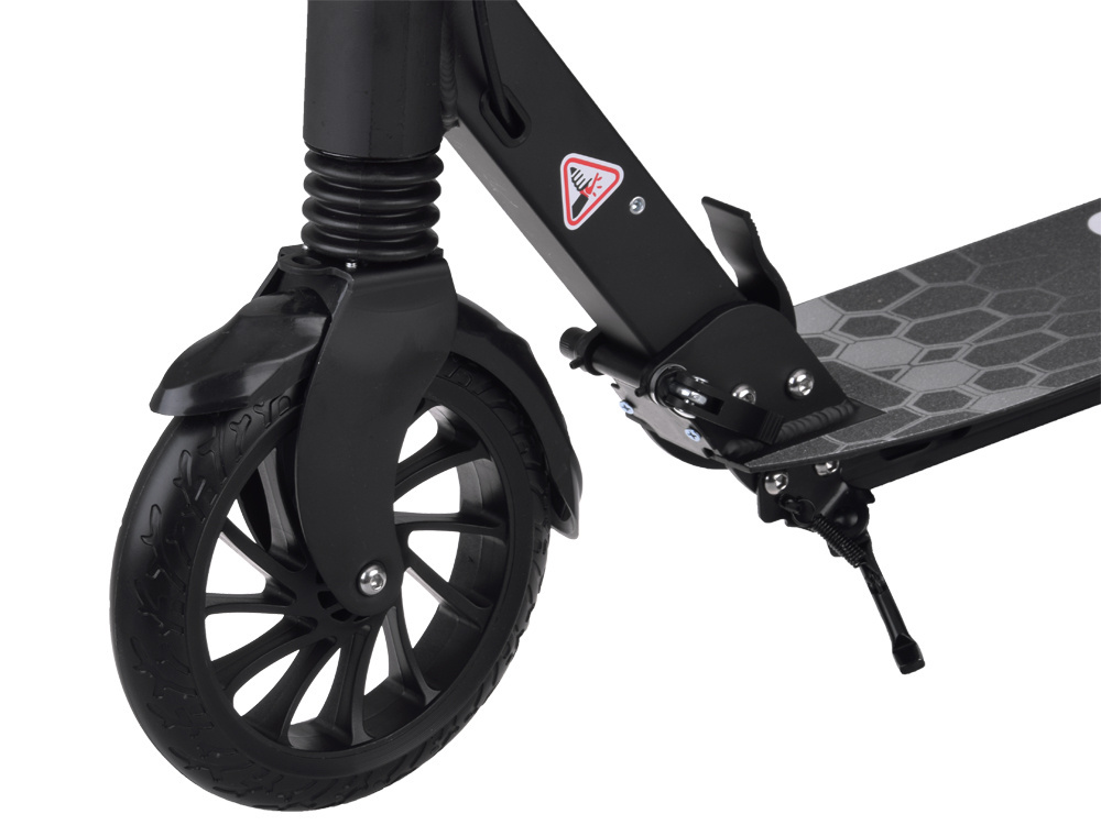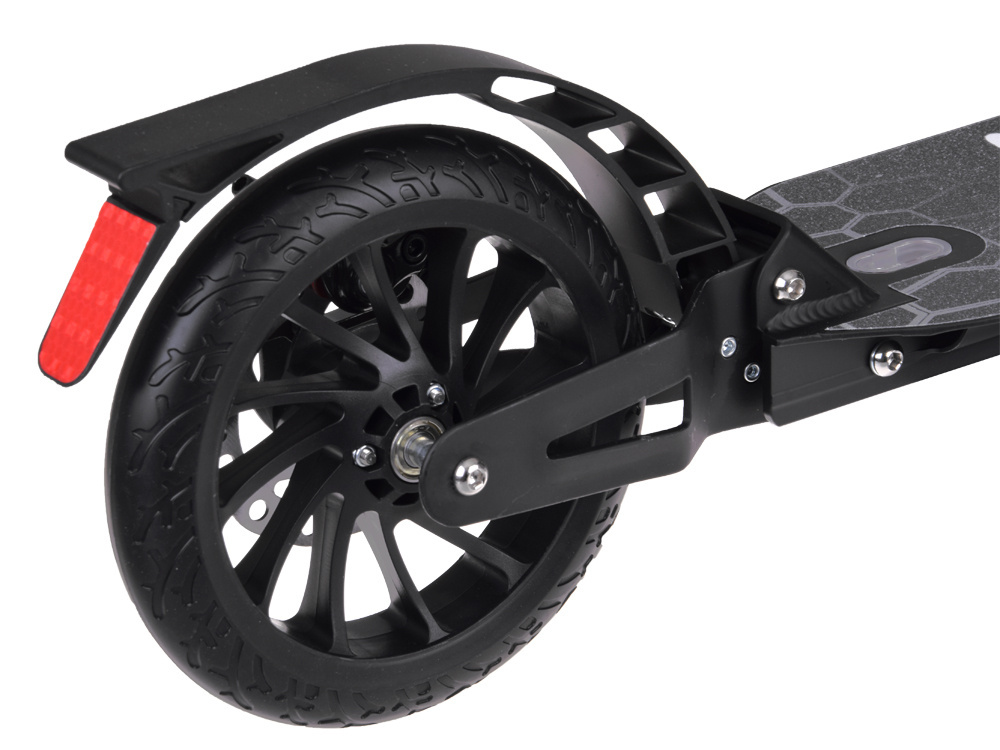 - Podwójny System Hamulcowy: Hulajnoga jest wyposażona w ręczny hamulec tarczowy oraz dociskowy hamulec na tylnym kole. Dodatkowo, tylny hamulec posiada odblask, zwiększając widoczność użytkownika.