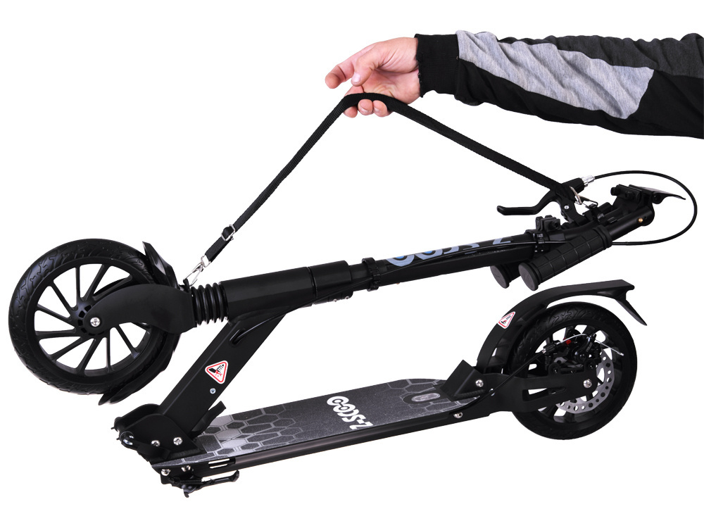 - Dodatkowe Akcesoria: W zestawie znajduje się pasek do przenoszenia. Hulajnoga posiada również podnóżek do bezpiecznego parkowania.