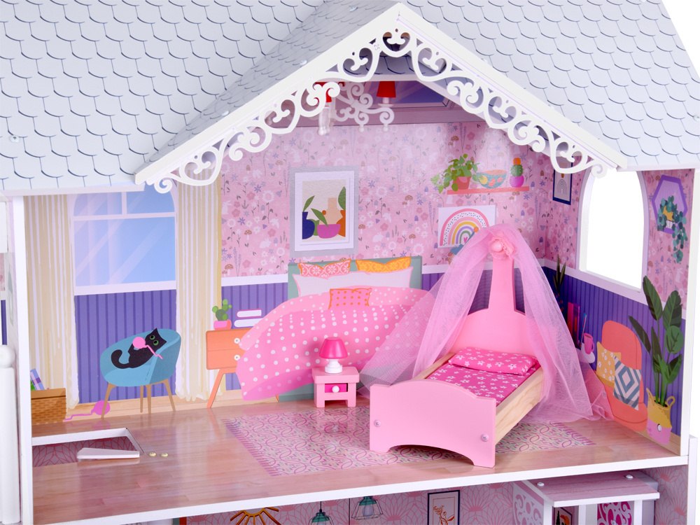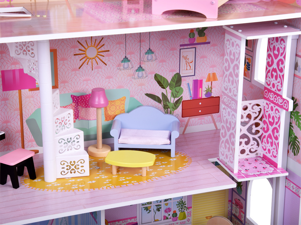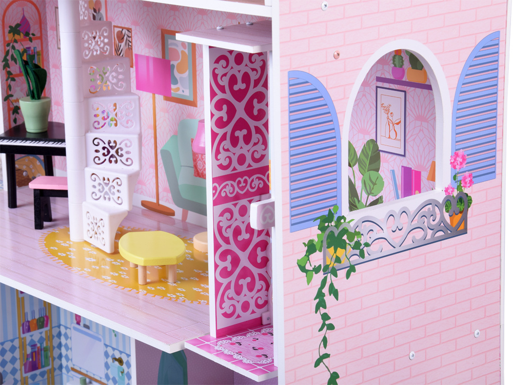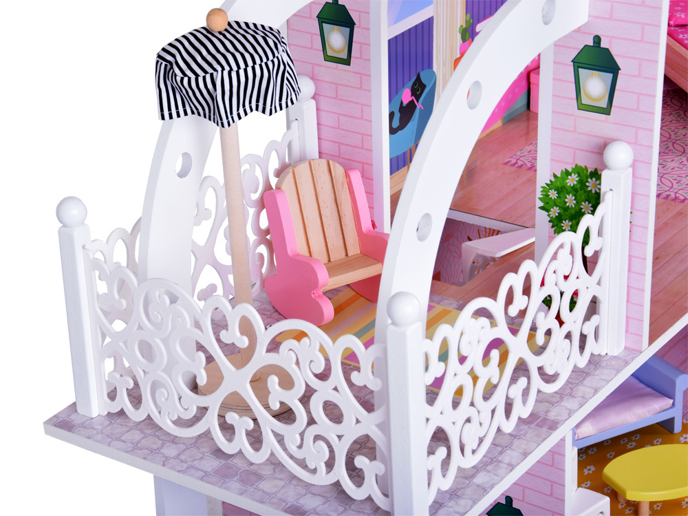 Winda, która umożliwia przesuwanie lalek między piętrami, wprowadza dodatkowy realizm do zabawy. Ażurowe wykończenie daje świetny efekt wizualny, domek anprawdę pięknie się reprezentuje na żywo.