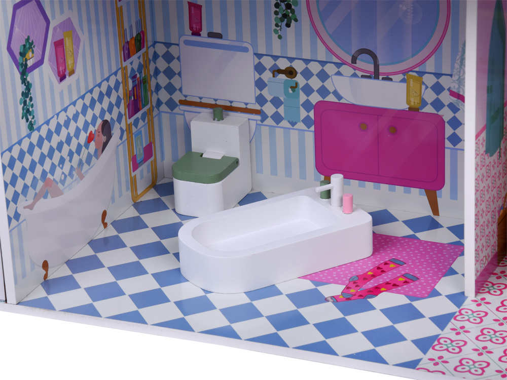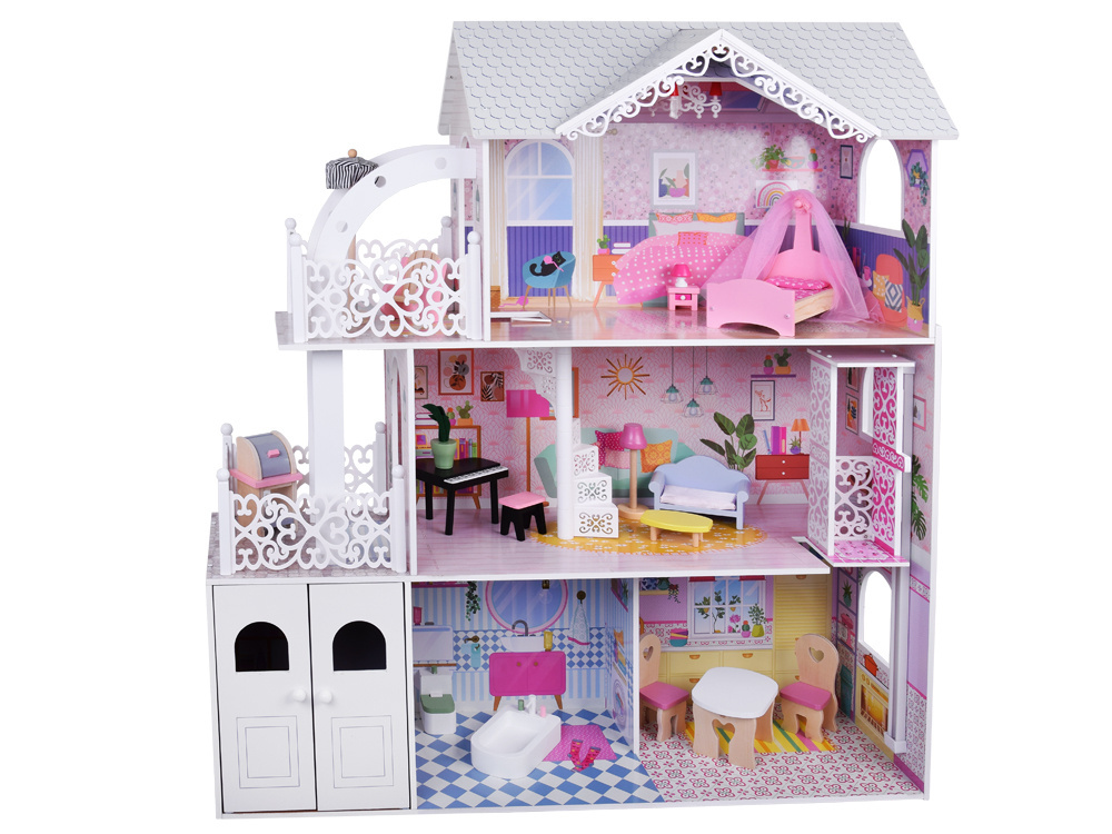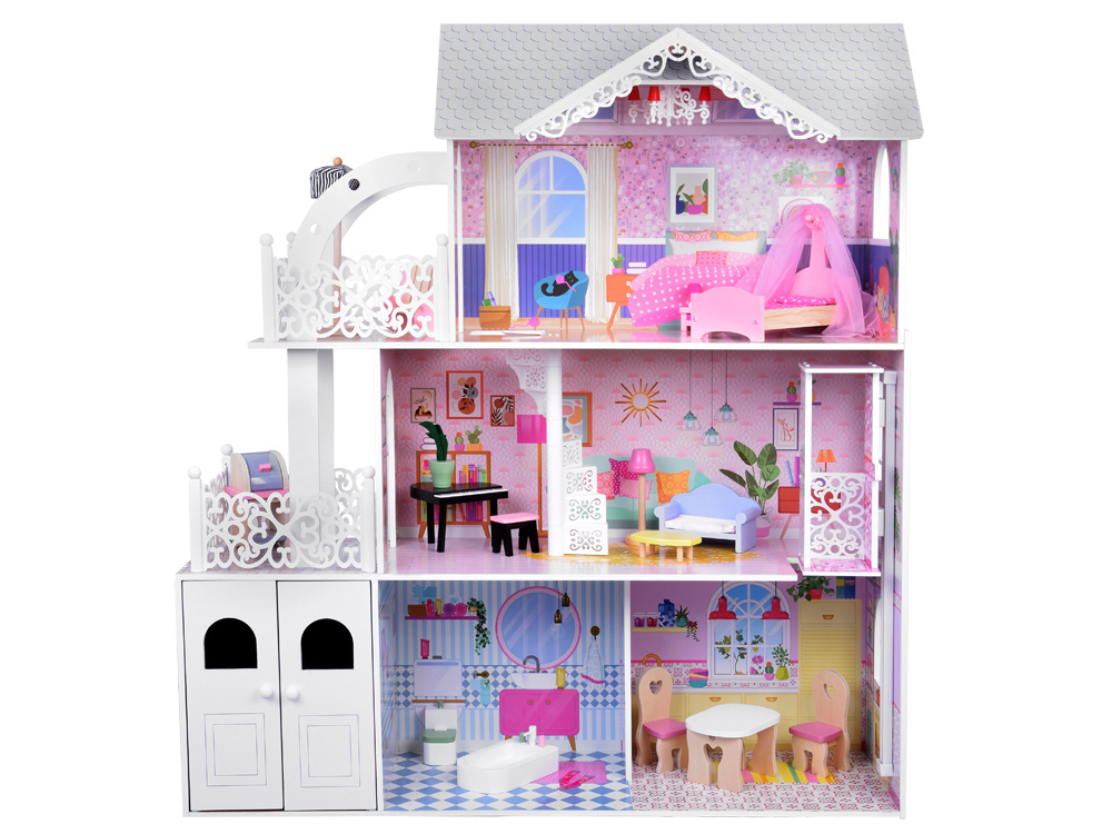 Piękny drewniany domek dla lalek to spełnienie marzeń każdej dziewczynki. Każdy element tej zabawki został starannie zaprojektowany i wykonany z wysokiej jakości drewna, plastiku oraz materiałów, z dbałością o najdrobniejsze detale. Drewniane części pokryto bezpieczną, nietoksyczną farbą, co zapewnia pełne bezpieczeństwo podczas zabawy. Domek jest do samodzielnego montażu – złożenie go zajmuje niewiele czasu. Produkt zapakowany jest w estetyczny szary karton z kolorową etykietą, a wewnątrz znajduje się styropianowe zabezpieczenie, gwarantujące bezpieczną wysyłkę.