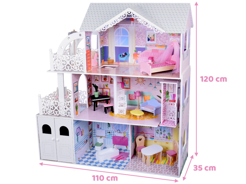 Duży Ażurowy Domek Drewniany dla Lalek – Z Windą, Garażem, Balkonem i Meblami – Stwórz wymarzoną przestrzeń dla swojej lalki!"