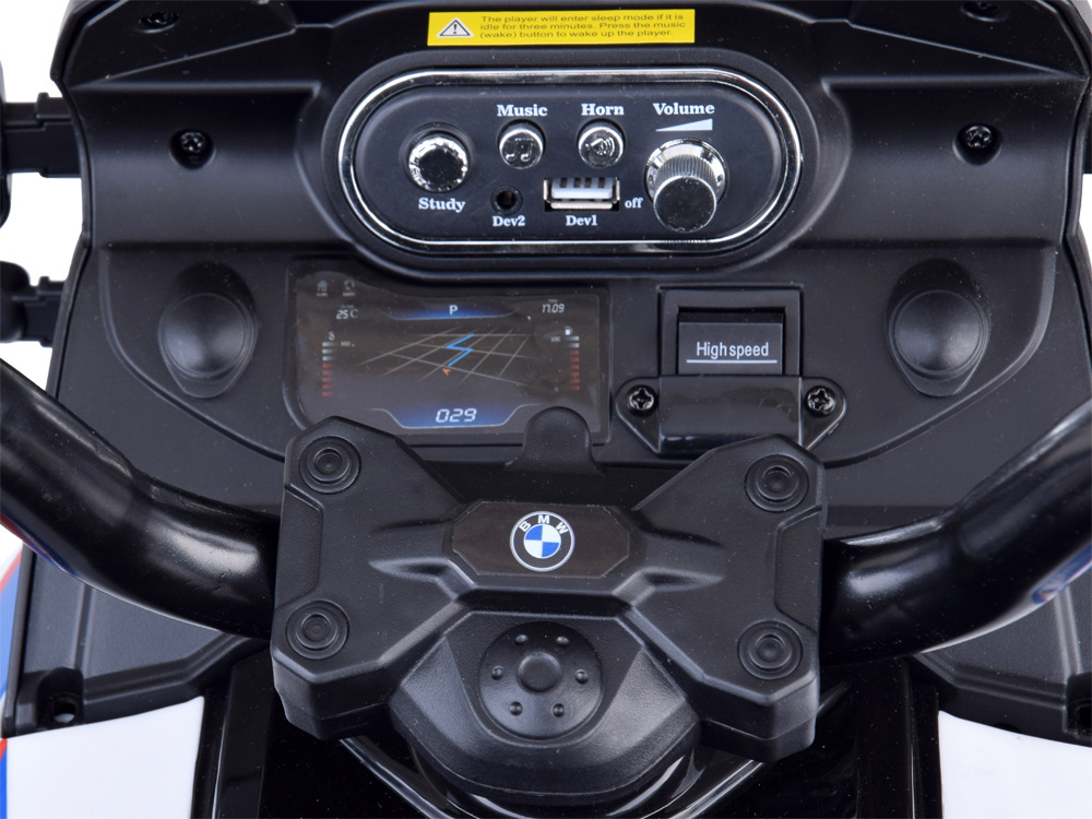 Pojazd przeznaczony dla dzieci od 3 roku życia. Motor posiada kółka boczne, dzięki czemu dziecko może poczuć się pewnie i bezpiecznie podczas jazdy, a stopka poprawia stabilność pojazdu podczas postoju. BMW odpalane jest za pomocą przycisku. Na desce rozdzielczej znajdziemy panel muzyczny z wgranymi melodiami i klaksonem a także wejściem na USB i mp3, dzięki czemu maluch podczas jazdy może słuchać swoich ulubionych piosenek. Motor posiada również przełącznik jazdy wolno/szybko. Przełącznik jest zabezpieczony ściąganą osłoną, dlatego to rodzic może zdecydować, czy dziecko jest już gotowe, by "wrzucić wyższy bieg" i jeździć z większą prędkością, co podnosi również bezpieczeństwo dziecka podczas jazdy. Koła motoru wykonane są z miękkiego tworzywa EVA, które zapewnią komfortową jazdę motorem. Pojazd posiada wolny start i jedzie po naciśnięciu pedału gazu w prawym podnóżku. Dodatkowo, podczas jazdy w motorze BMW świecą przednie światła, co podnosi realizm zabawy. W sakwach po bokach dziecko może schować kartonik z napojem, przekąskę lub inny cenny drobiazg, który przyda się podczas jazdy.