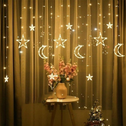 Lampki kurtyna świetlna składająca się z gwiazd oraz księżyców. Ozdoba posiada 4 różne długości sopli co sprawia, że pięknie się prezentuje i ma dużą powierzchnię świecenia. Cechy produktu -zasilanie: 230V 50Hz -IP44 -barwa świecenia: ciepła biała -8-funkcyjny programator: światło stałe, rozbłysk, flash, sekwencja, fala, kombinacja, pełzanie, rozjaśnianie -przepalenie diody nie wygasza zestawu -złączka do łączenia takich samych zestawów -kabel zasilający: 120cm -odstępy między ozdobami: 24cm -dł. od programatora do złączki: 300cm -dł sopli: 70/40/60/100cm -ilość LED: 132 = 3*(12+7+13+12) Ilość szt. na palecie: 420