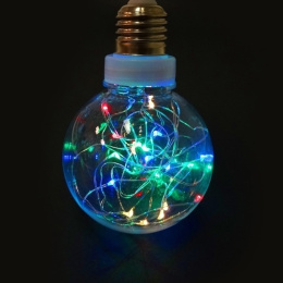 Żarówka-bombka LED. CCechy produktu: - średnica 12 centymetrów - posiada w środku łańcuch z 30 diod LED - święcą na wiele kolorów - Zasilanie 2 x AA(nie załączono) - zasobnik baterii z włącznikiem - klasa IP 20 - waga 100g. - ilość w kartonie: 50szt