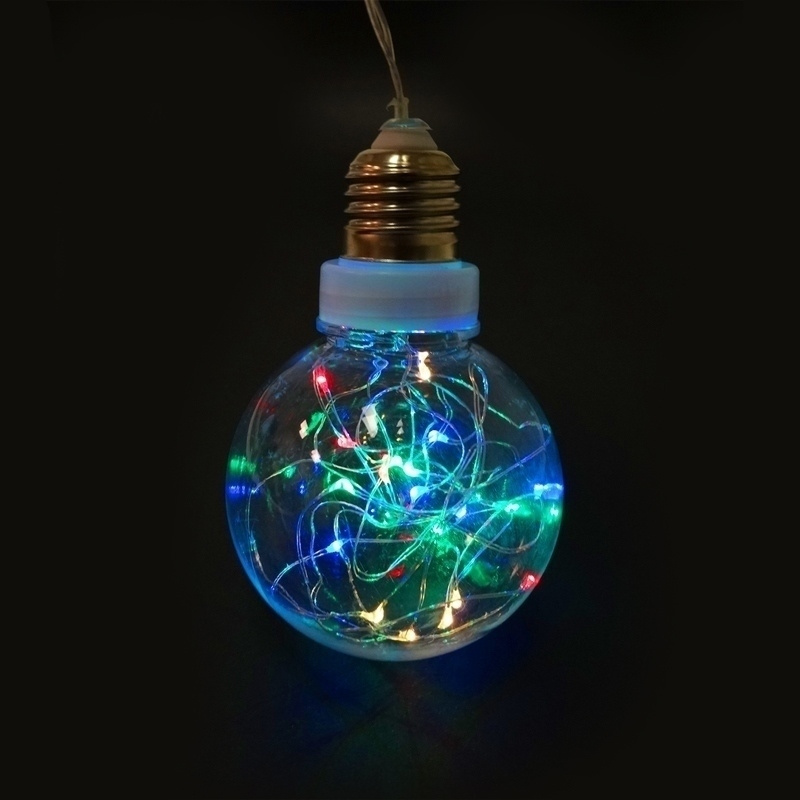Żarówka-bombka LED. CCechy produktu: - średnica 8 centymetrów - posiada w środku łańcuch z 20 żarówek LED - święcą na wiele kolorów - zasilanie bateria 2 x AA(nie załączono) - zasobnik baterii z włacznikiem - klasa IP 20 - waga 50g. - ilość w kartonie: 100szt