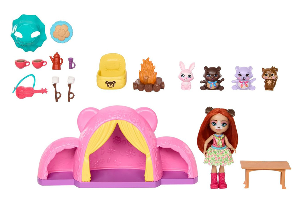 Zestaw Enchantimals Tent Camping Cuddlers™ z pewnością przypadnie do gustu każdej fance tych uroczych laleczek i ich futrzastych towarzyszy zabawy! Tym razem lalka Enachantimals zabiera swoich podopiecznych na kemping! Jakie czekają ich przygody? Wszystko zależy od naszej wyobraźni! Może siądą razem przy ognisku, piekąc pianki, z gitarą w ręce? A może wyruszą na poszukiwanie zaginionego zwierzaka?