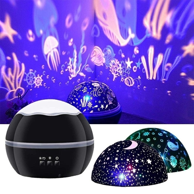 Lampka nocna LED - projektor gwiazd. Głowica obraca się wyświetlając projekcje w 4 kolorach (białym, niebieskim, zielonym, czerwonym). Specyfikacja: 8 różnokolorowych trybów świecenia (pojedyncze kolory, kombinacje kolorów oraz płynne przejścia) wymienne filtry do projekcji (księżyc z gwiazdami oraz morska głębia) obrotowa głowica możliwość uruchamiania trybów lampki niezależnie od siebie (podświetlenie, rotacja) zasilanie: DC 5V 1A (kabel USB do ładowania w zestawie) lub 4 baterie AAA (brak w zestawie) wymiary: 13x13x11cm