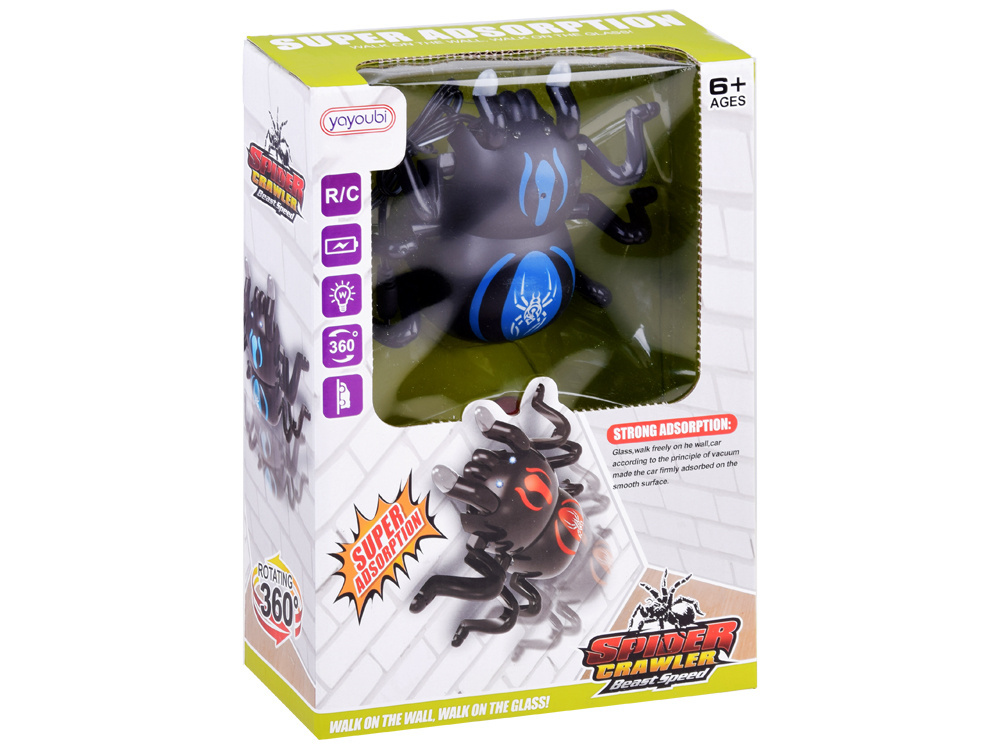 Die Spinne und die Fernbedienung werden automatisch synchronisiert. Drücken Sie einfach die Taste auf der Fernbedienung in die Position ON und dann die Taste auf dem Bauch der Spinne. Durch Verschieben des Knopfes um eine Position nach links wird das Modell abgesenkt, so dass es auf einer ebenen Fläche gesteuert werden kann. Ein weiterer Druck auf den Knopf startet den Motor, der Luft ansaugt, so dass die Spinne an der Wand "klebt"! Die Spinne kann über Wände, Glas und andere glatte Oberflächen laufen. Die Spinne bewegt sich sehr realistisch.