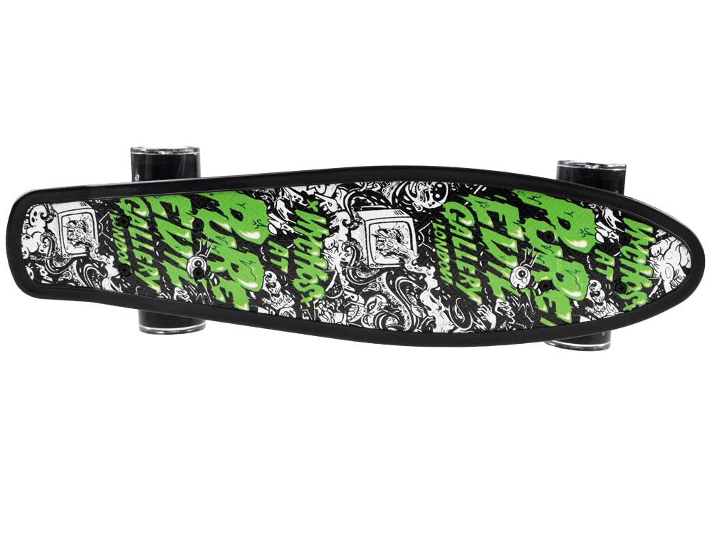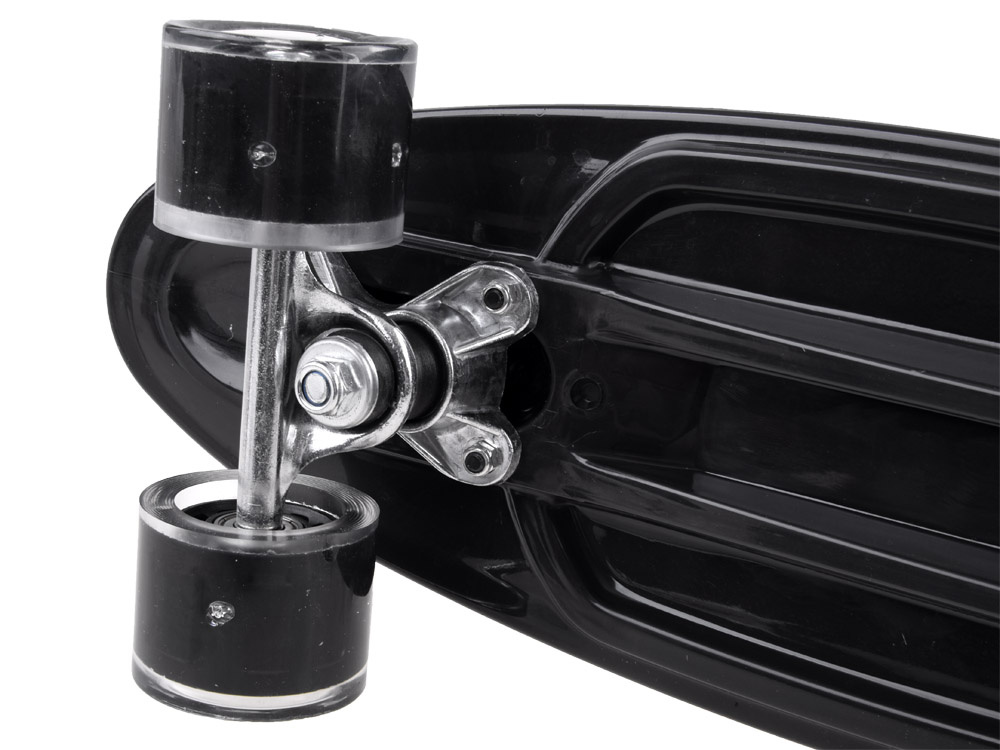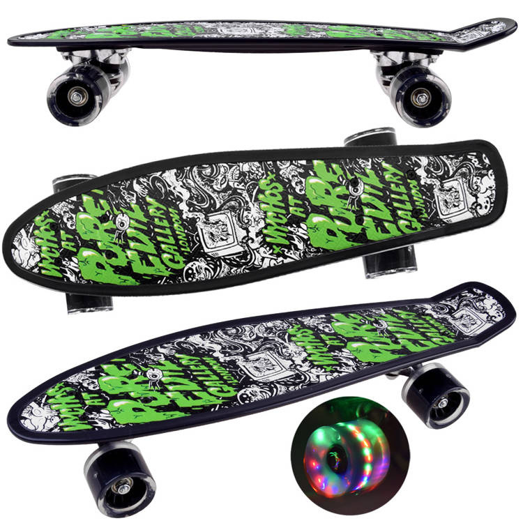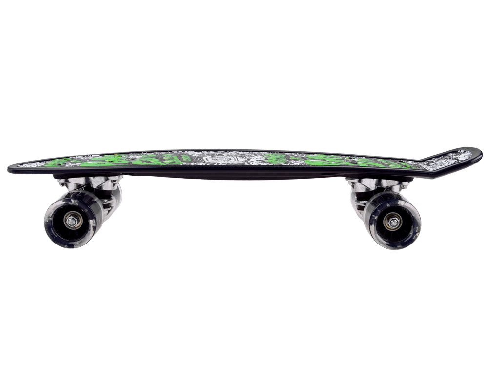 Das Skateboard ist aus Kunststoff gefertigt, gummigefedert und ermöglicht das Fahren in der Freizeit. Konzipiert für Kinder und junge Menschen. Ideal zum Spielen bei einem Spaziergang. Phish bietet Ihnen ein fantastisches Spielerlebnis. Die Räder sind aus hochwertigem PU,, gefertigt und bieten guten Grip und Stoßdämpfung. Darüber hinaus sind die Räder mit LEDs ausgestattet, die während der Fahrt leuchten und so die Sichtbarkeit und Attraktivität des Boards erhöhen. Die Beleuchtung braucht keine Batterien, dafür sorgt die magnetische Energie, die beim Drehen des Rades entsteht.