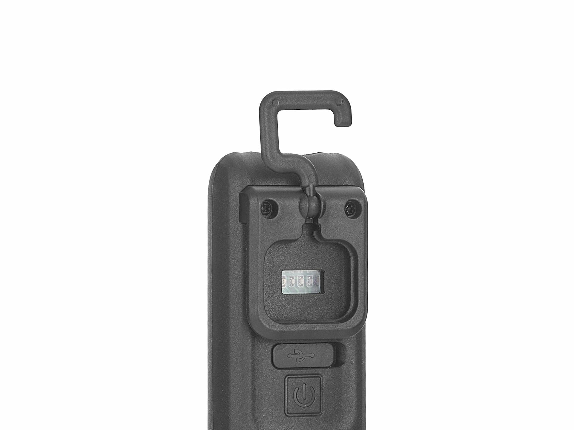 Die Lampe wird mit einem Magneten befestigt, wodurch sie leicht an Metalloberflächen rund um den Arbeitsplatz angebracht werden kann. Außerdem verfügt die Lampe über einen praktischen Haken, mit dem Sie sie überall aufhängen können.