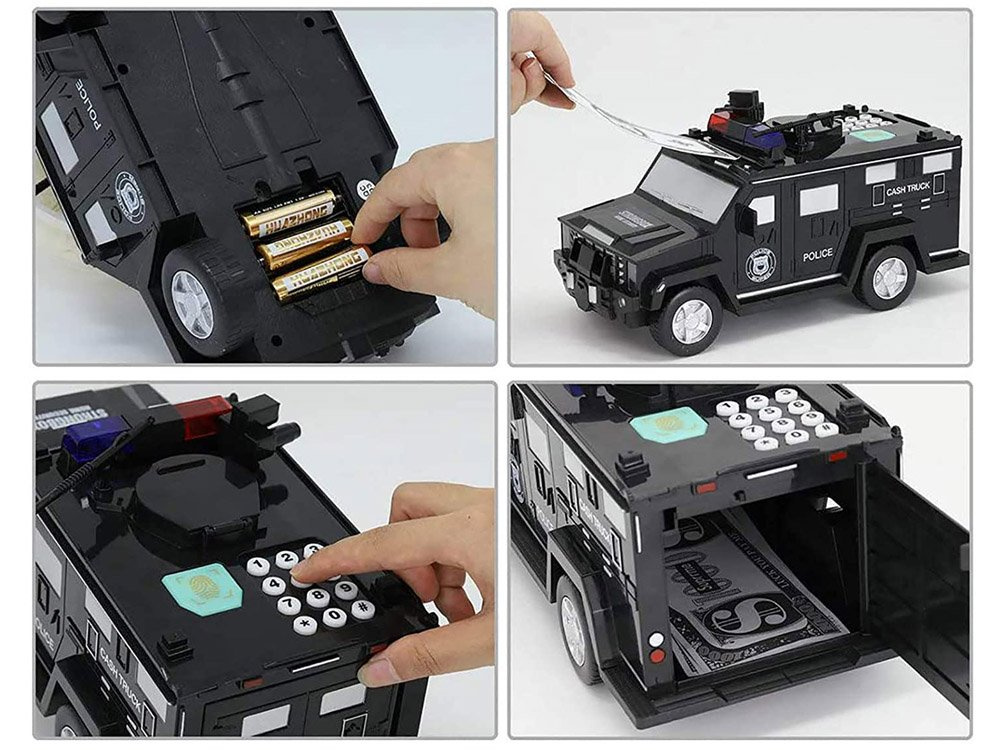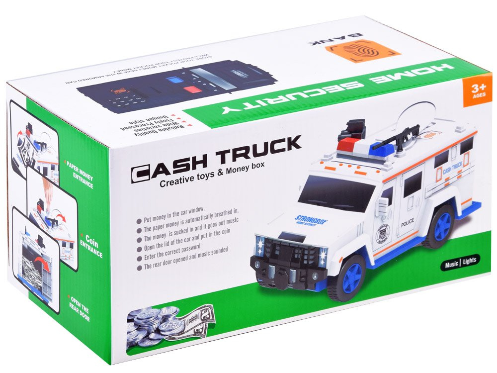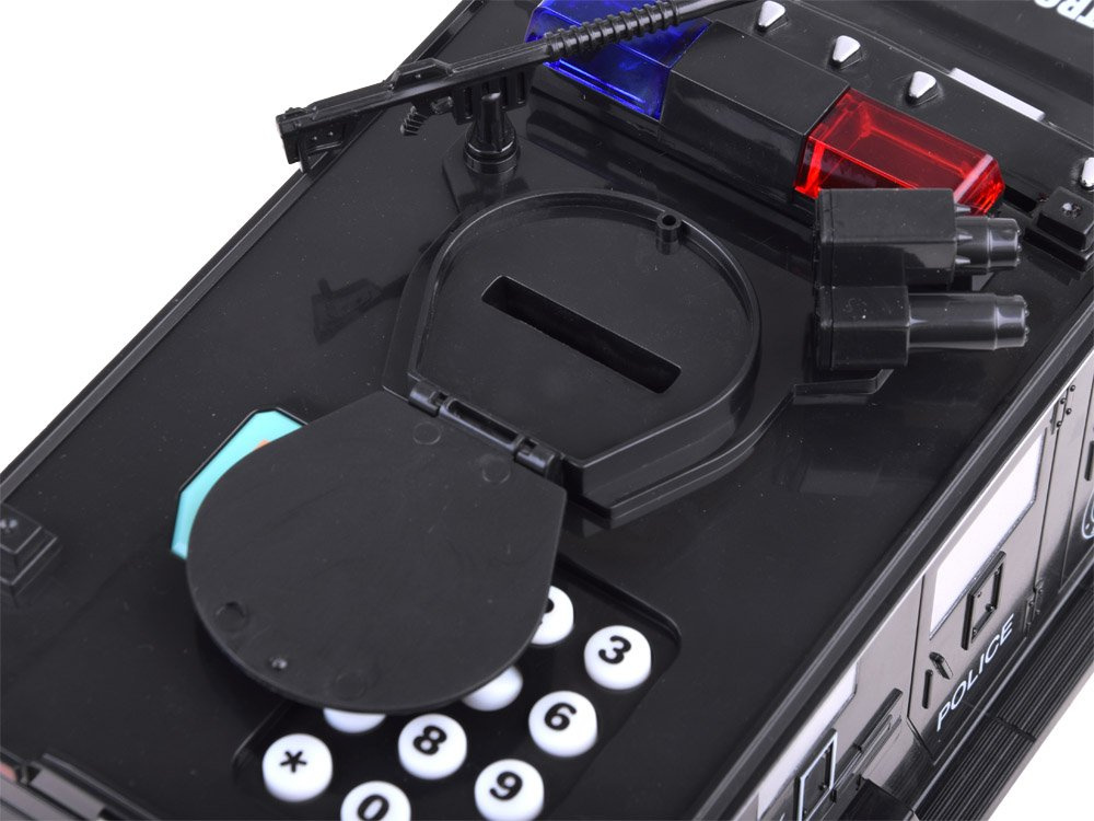 DasPolizeifahrzeug mit Registrierkasse ist ein Sondereinsatzfahrzeug. Das Auto mit den Soundeffekten soll die Ersparnisse der Kinder schützen und aufbewahren. Dieses Auto erfüllt diese Anforderungen. Das Polizeiauto verfügt über einen Zugangscode, mit dem sich die Tür nach dem Scannen des Fingerabdrucks automatisch öffnet, und im Auto sind außerdem tolle Soundeffekte versteckt. Ein Polizeiauto soll ein Spielzeug sein, aber in Wirklichkeit ist es ein Safe für dein Geld : )