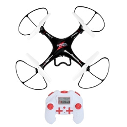 Quadcopter z kamerą HD wyposażony w 6-osiowy stabilizator żyroskopowy, wyrównujący lot. Prędkość lotu jest regulowana (niska, średnia, wysoka). Model może latać w górę, w dół, do przodu, do tyłu, skręcać w lewo i prawo. Dron może wykonywać spektakularne ewolucje w powietrzu: radykalne koziołki, rolki i inne akrobacje. Został wyposażony w diody led plus szperacz (jasna dioda led), umożliwiają sterowanie nocą. Lot można rozpocząć podrzucając quadrocopter w górę lub z ziemi. Dane techniczne: - pilot zasilany 4xAA (AA brak w zestawie) - odbiornik: 2,4 GHz - 6 kanałów - zasięg radiowy 80-100 m- - czas lotu 24-32 min (na 3 bateriach) - czas ładowania 30-40 min. - akumulator LiPo 3.7 V 550 mAh + 2szt zapasowe - kąt obrotu 360 stopni - wysoka stabilność lotu - oświetlenie LED - wymiary całkowite: 27 x 27 x 8 cm przekątna 38cm - podwieszana kamera HD - posiada możliwość wymiany akumulatora W zestawie: -dron 6kanałów +osłony -nogi -kamera HD -pilot zdalnego sterowania -czytnik kart USB -karta microSD 1gb -ładowarka USB -2xakumulatory zapasowe -zapasowe śmigła 4szt -śrubokręt -instrukcja w jezyku polskim Waga: 220g