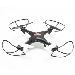 Dane techniczne: - pilot z możliwością ładowania drona zasilany 6xAA (AA brak w zestawie) - odbiornik: 2,4 GHz - 6 kanałów - zasięg radiowy 60-80 m - czas lotu 8-9 min. - czas ładowania 30-40 min. - akumulator LiPo 3.7 V 500 mAh - kąt obrotu 360 stopni - wysoka stabilność lotu - oświetlenie LED - wbudowana kamera HD - wymiary całkowite: 32 x 32 x 7,5 cm przekątna 37cm - posiada możliwość wymiany akumulatora - wbudowany adapter Wi-Fi - obraz na żywo na smartfonie z Androidem W zestawie: -dron 6kanałów +osłony -nogi -pilot zdalnego sterowania -uchwyt monopad na telefon -ładowarka USB -zapasowe śmigła 4szt -śrubokręt -instrukcja w jezyku polskim -kolorowe pudełko Quadcopter 37cm z wbudowaną kamerą HD, wyposażony w 6-osiowy stabilizator żyroskopowy, wyrównujący lot. Wbudowany adapter Wi-Fi pozwala na połączenie z smartofonem. Prędkość lotu jest regulowana (prędkość niska, średnia, wysoka). Model może latać w górę, w dół, do przodu, do tyłu, skręcać w lewo i prawo. Dron może wykonywać spektakularne ewolucje w powietrzu: radykalne koziołki, rolki i inne akrobacje. Został wyposażony w diody led plus szperacz (jasna dioda led), umożliwiają sterowanie nocą.