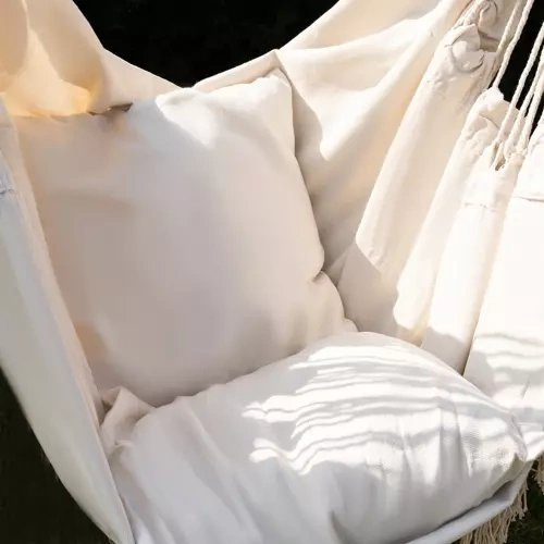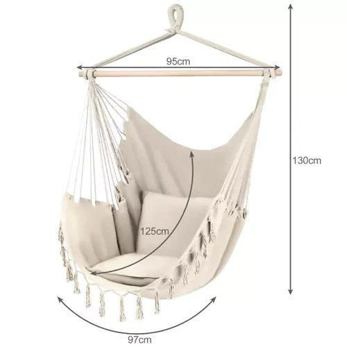 ROBUSTES MATERIAL - 65% Baumwolle sorgt für die richtige Belüftung, was den Komfort der Nutzung des Hängesessels auch an heißen Tagen beeinflusst. Für die Festigkeit des Sitzes ist ein 35%iger Polyesterzusatz verantwortlich. Ein festes Montage-Rad ist mit einem robusten Seil verbunden, das gleichmäßig an den Seiten der Hängematte über eine Holzstange verteilt ist. Diese Konstruktion bildet ein Ganzes, das leicht aufzuhängen ist, und die Hängematte ist gut ausbalanciert und stabil.
