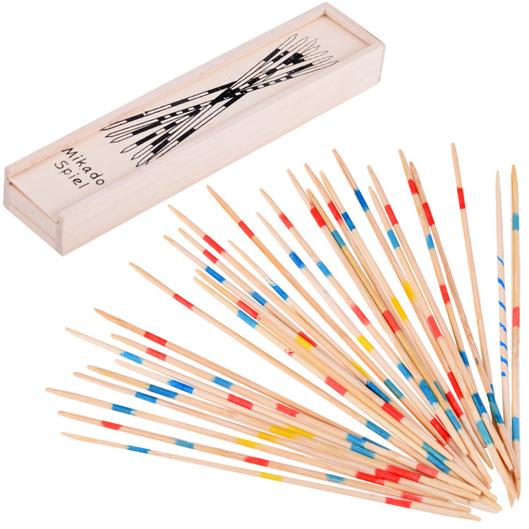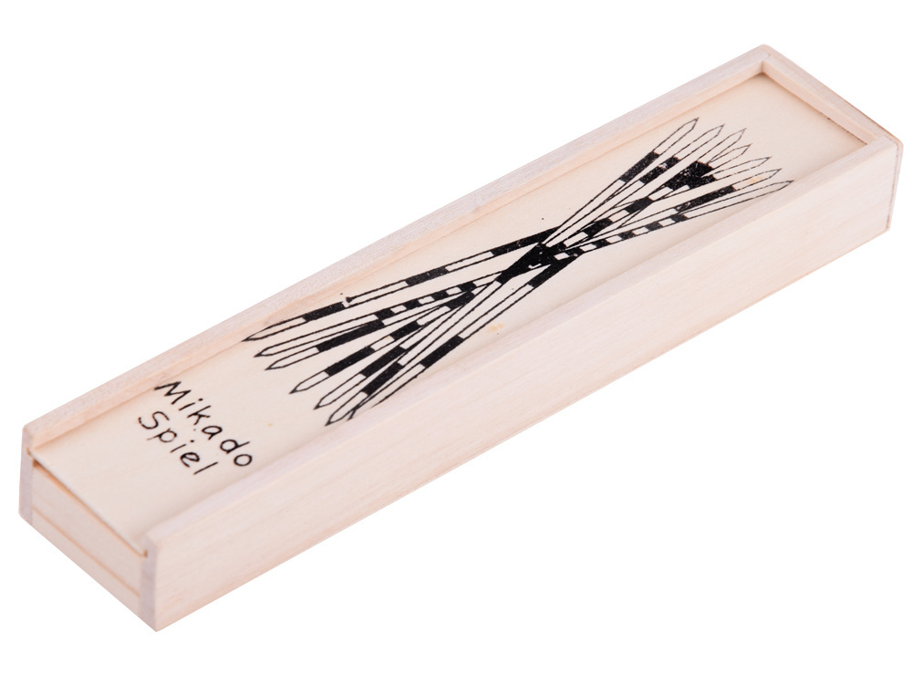Mikado ist ein Arcade-Spiel, das von mindestens zwei Personen gespielt wird.Die einzelnen Barren unterscheiden sich durch die Anzahl und Farbe der aufgemalten Streifen, die den Wert des Geldbeutels angeben. Um das Spiel zu beginnen, verstreuen Sie ein Bündel von Stöcken auf dem Tisch und halten Sie sie senkrecht in der hohlen Hand. So entsteht ein Stapel, von dem die Spieler einen Würfel nach dem anderen nehmen müssen, um die anderen nicht zu verschieben. Wird auch nur eine Leiste während des Spiels verschoben, ist der Zug verloren und der nächste Spieler übernimmt die Aufgabe. Gewinner ist der Spieler, der die meisten Stöcke sammelt. Das Spiel fördert Geduld, Konzentration und die Fähigkeit, den eigenen Körper zu kontrollieren.