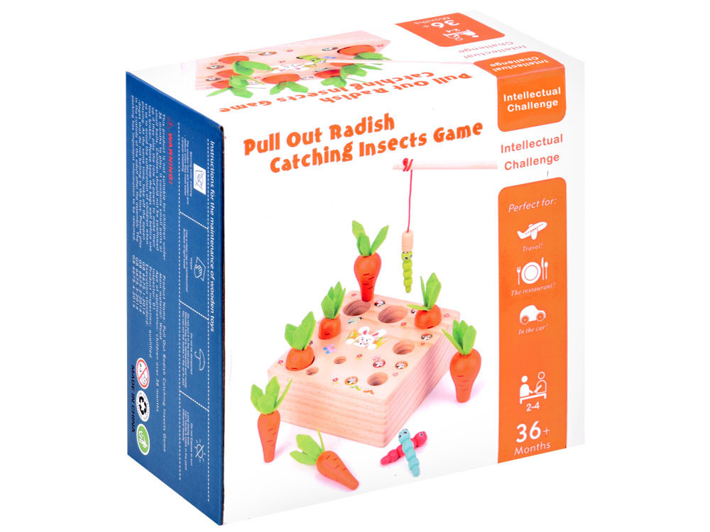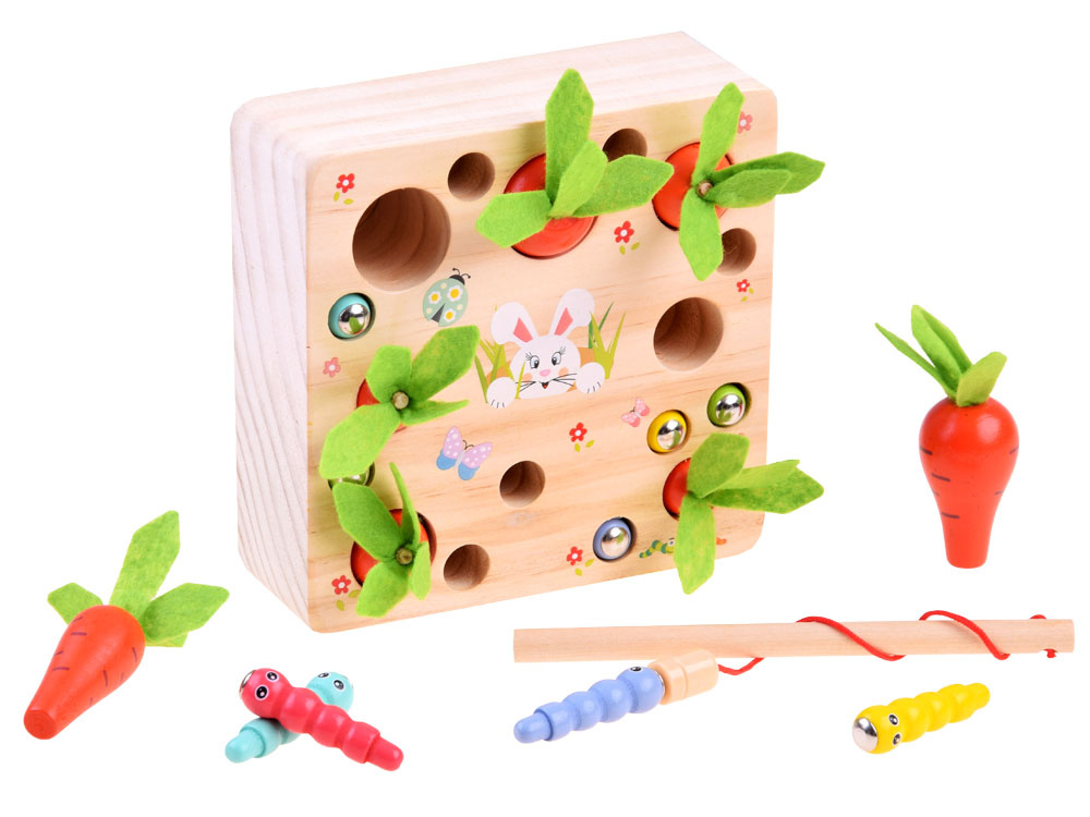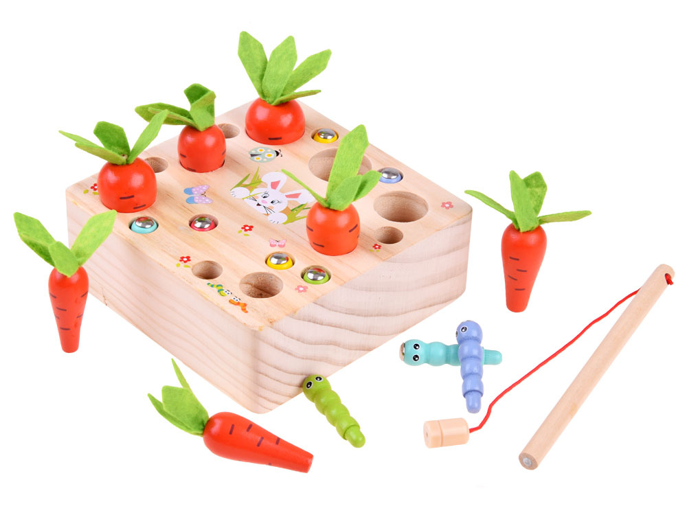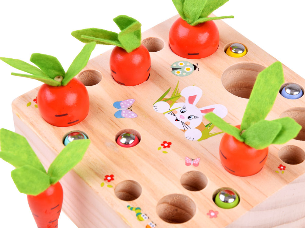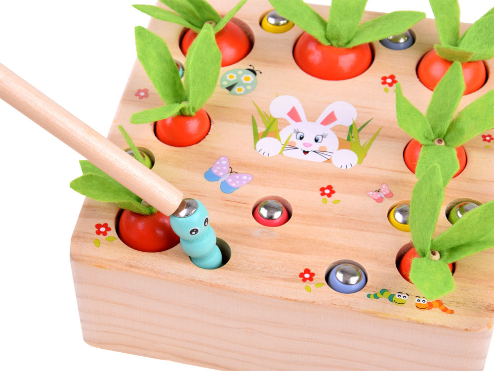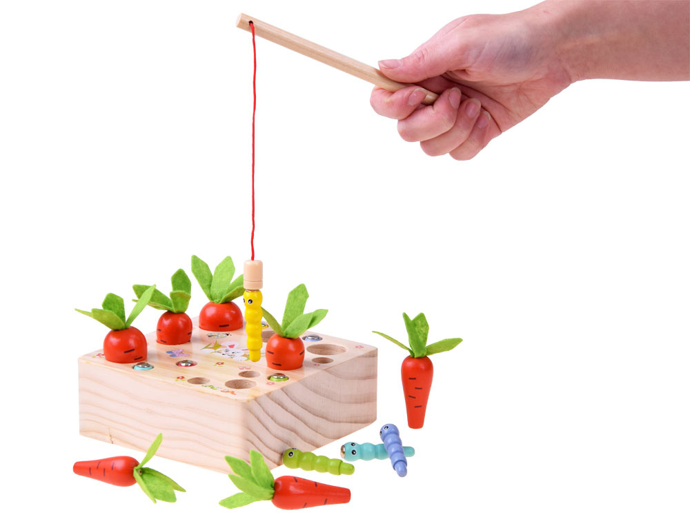 Das hölzerne Zuordnungsspiel Karotten und Würmer ist ein Spielzeug für die Kleinsten. Dank der fröhlichen Farben und der hübschen Grafik, die die Aufmerksamkeit auf sich zieht und zum Spielen anregt, wird das Spiel sicher jedes Kleinkind ansprechen. Dank dieses interessanten Spiels haben die Kinder die Möglichkeit, sich in vielerlei Hinsicht zu entwickeln und zu spielen. Die Kinder können allein oder zusammen mit Gleichaltrigen spielen.