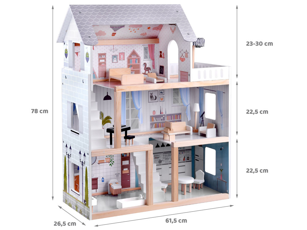 Dieses stilvolle Puppenhaus mit Geschichte und Möbeln wird jedem Mädchen großen Spaß bereiten. Das Haus ist sehr schön gemacht, es wird jedes Kind begeistern und passt in jedes Kinderzimmer. Das Haus hat 3 Etagen, die alle elegant und stilvoll eingerichtet sind. Das Puppenhaus ist mit allen notwendigen Möbeln für einen komfortablen Betrieb ausgestattet. Die Verarbeitung des Hauses ist sehr auffällig, das Spiel mit einem solchen Haus wird ewig weitergehen. Das Spielzeug ist für die Selbstmontage konzipiert. Der Zusammenbau des Hauses dauert maximal 30 Minuten. ist sehr einfach und intuitiv. Das Haus ist in einem Karton verpackt, der innen mit Styropor für einen sicheren Transport geschützt ist.