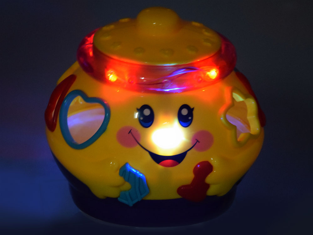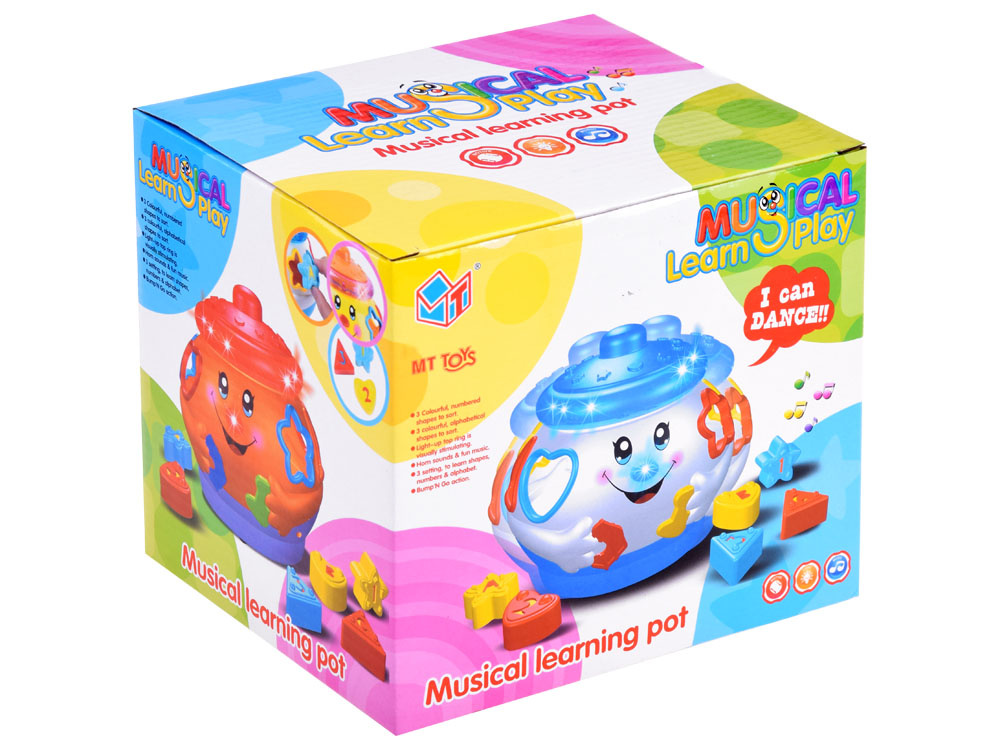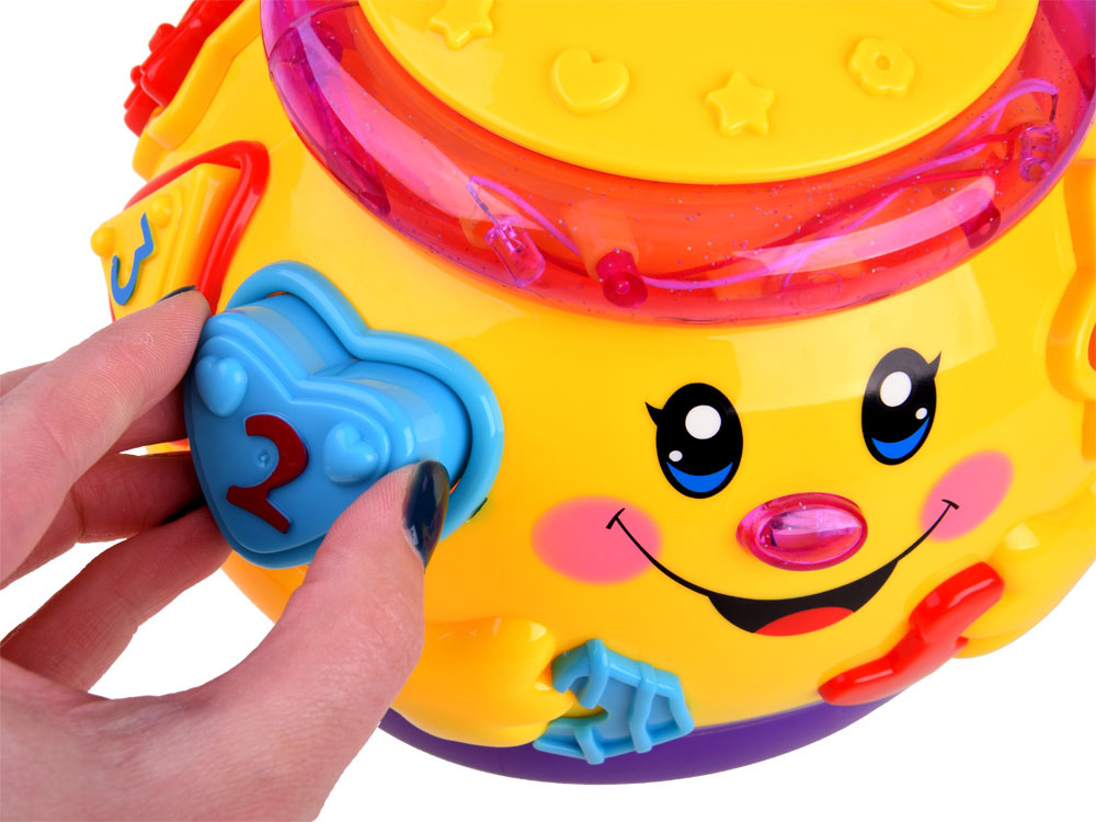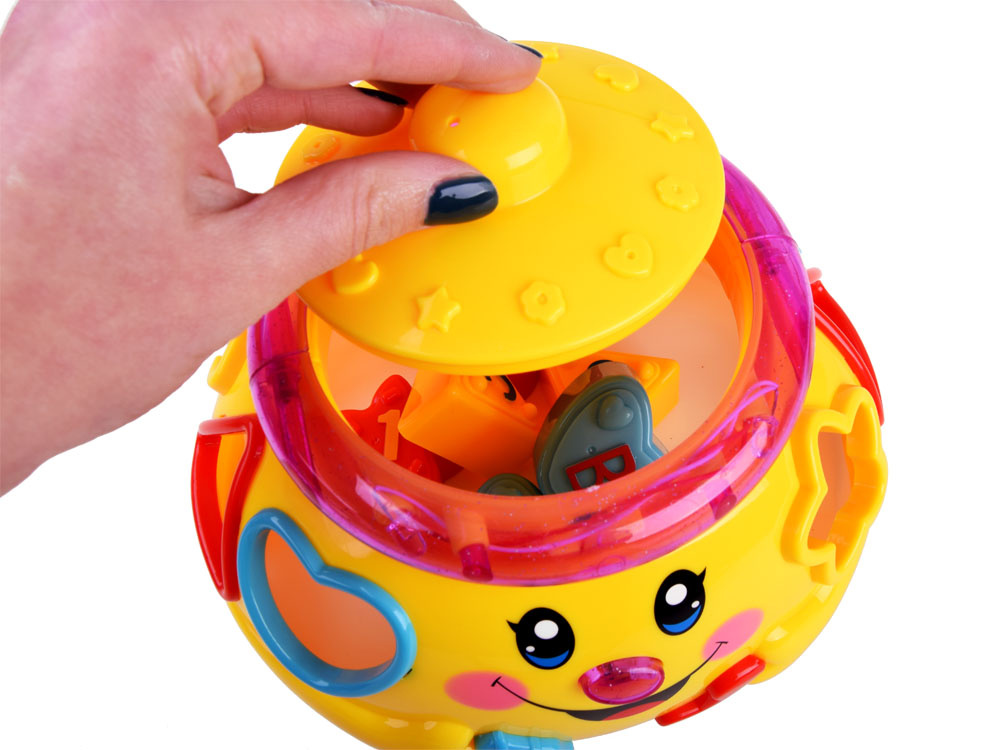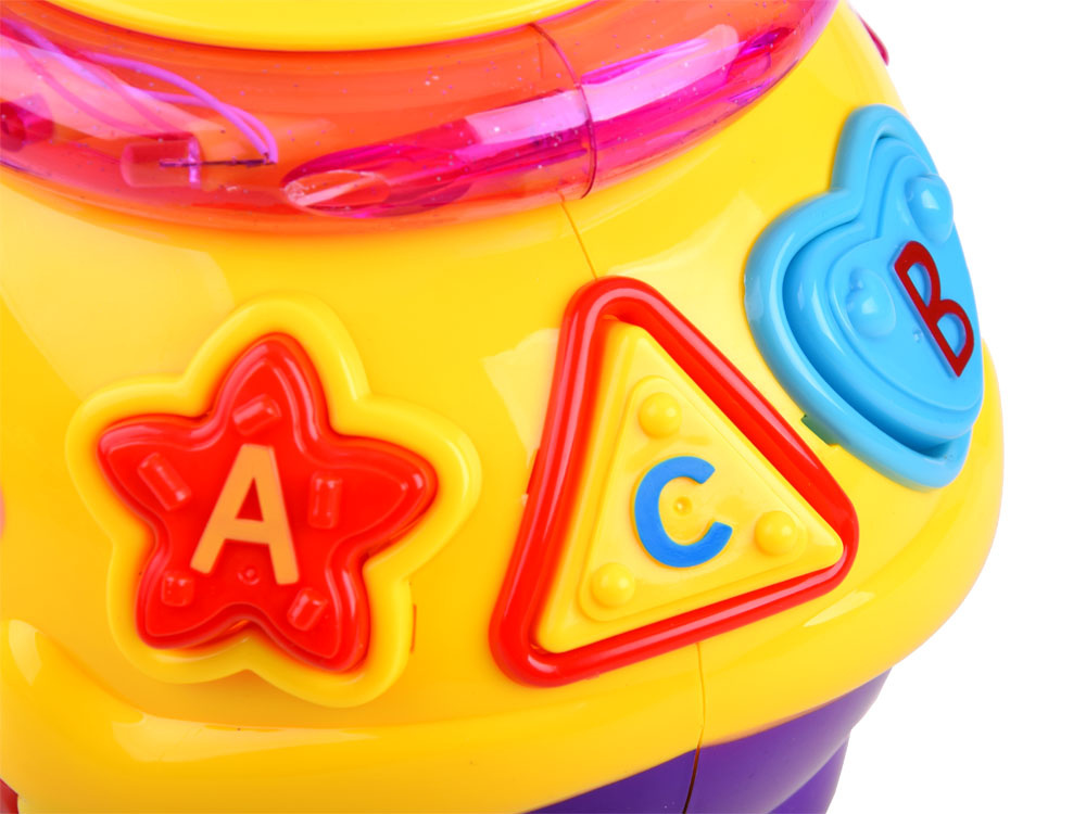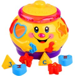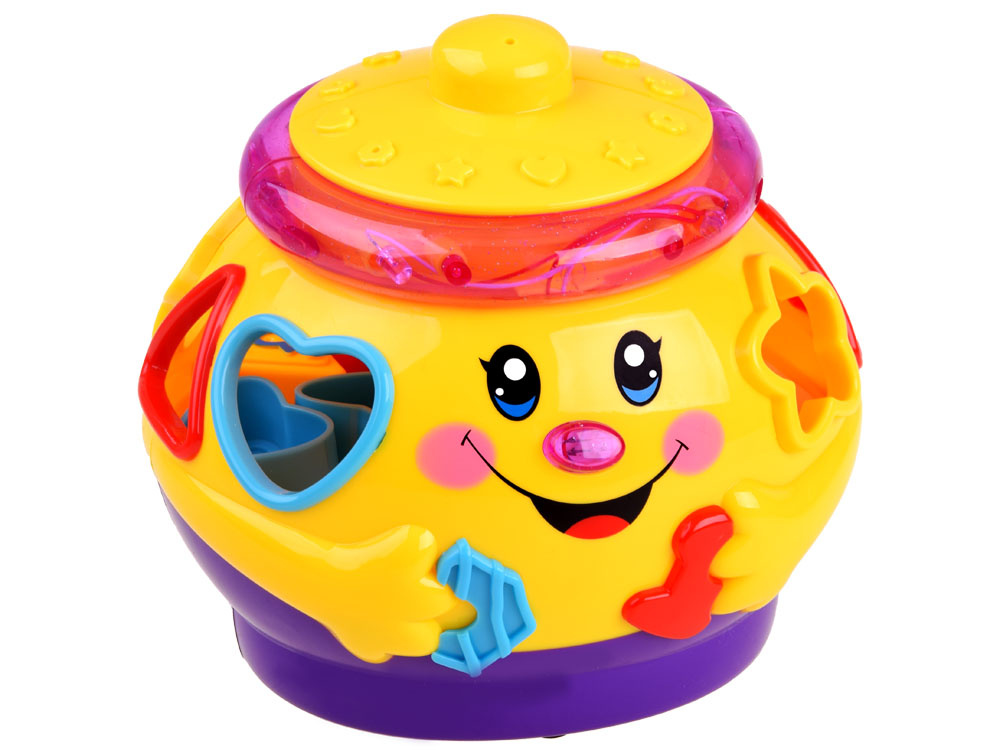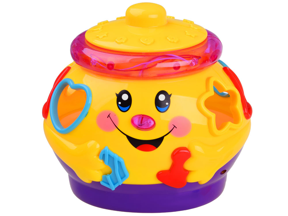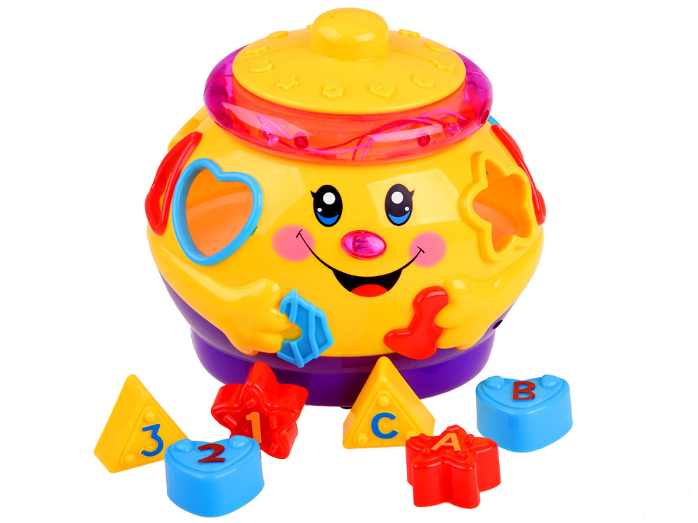 Ein interaktives Spielzeug aus der Reihe "Lernen und Spielen", bei dem das spielerische Lernen im Vordergrund steht. Das Spielzeug enthält 6 farbige Würfel, die in die dafür vorgesehenen Löcher gesteckt werden müssen. Jeder Block hat eine andere Form und ist mit einer Zahl oder einem Buchstaben gekennzeichnet. während des Spiels lernt das Kind, Formen und Farben zu unterscheiden. Der bunte, fröhliche Topf spielt beim Einschalten fröhliche Musik, fährt auf Rädern und schaukelt fröhlich, der Rand leuchtet und blinkt mit bunten Lichtern. nach dem Einlegen der Blöcke in die Sortiermaschinen werden sie in den Bauch des Topfes gelegt. In den sperrigen Bauch des Topfes passen nicht nur Würfel, sondern wahrscheinlich auch andere notwendige Schätze für ein Kleinkind.