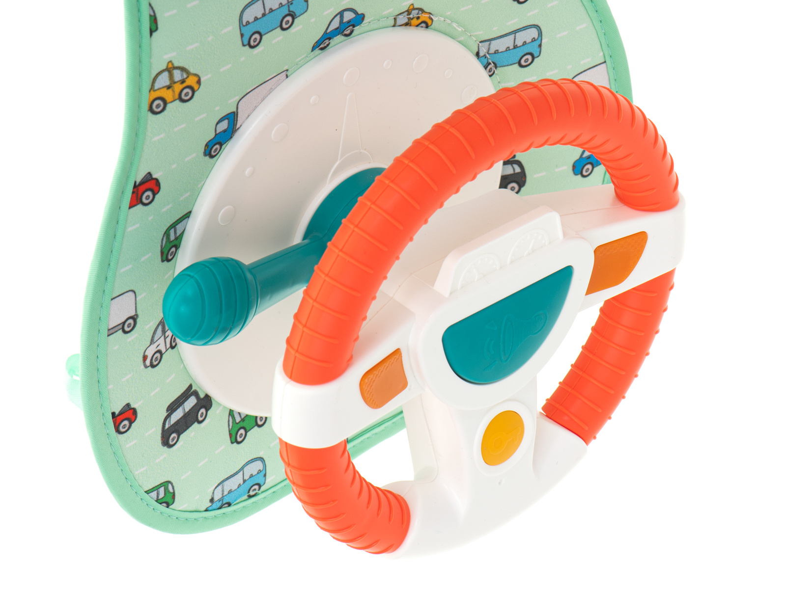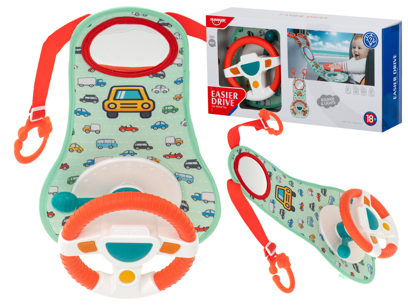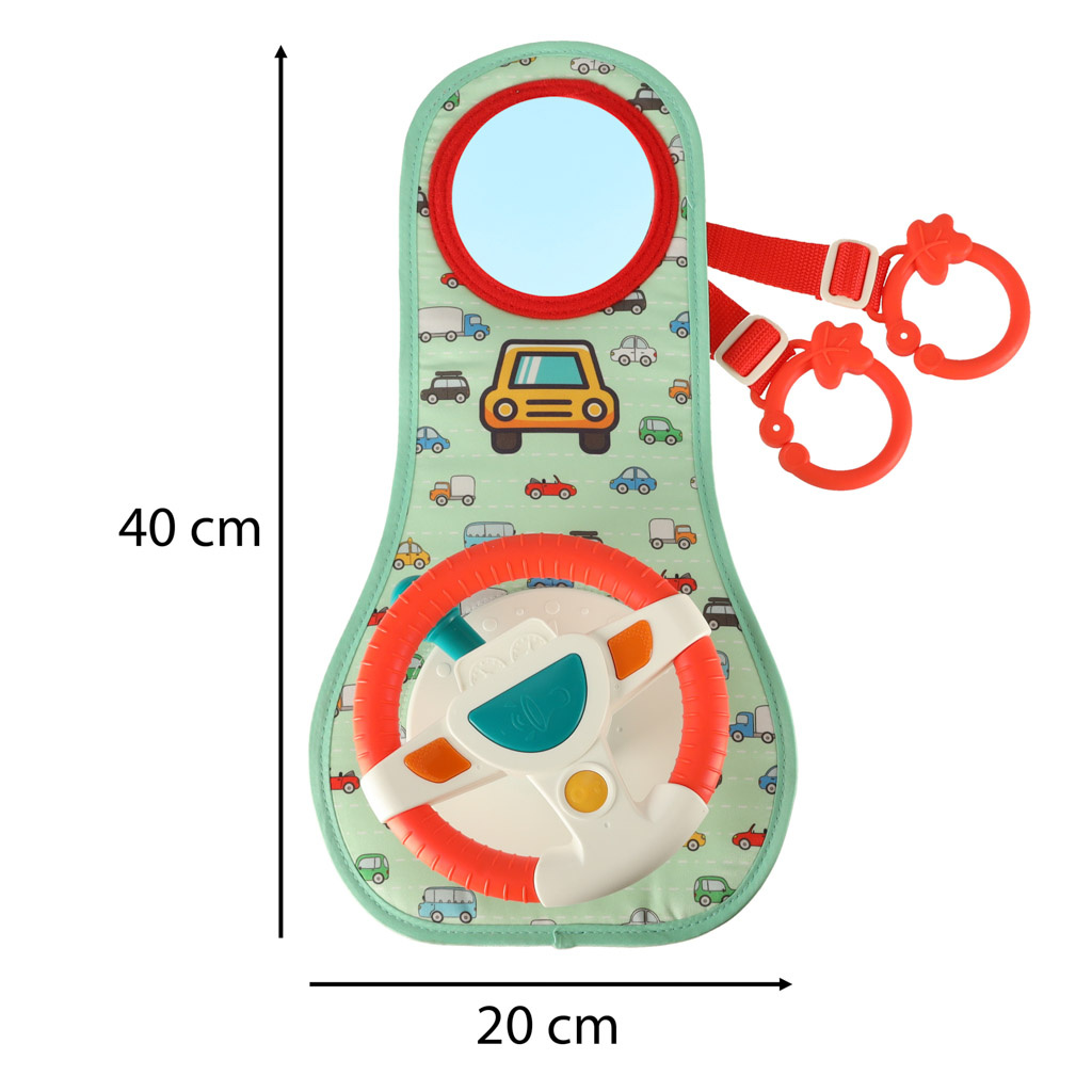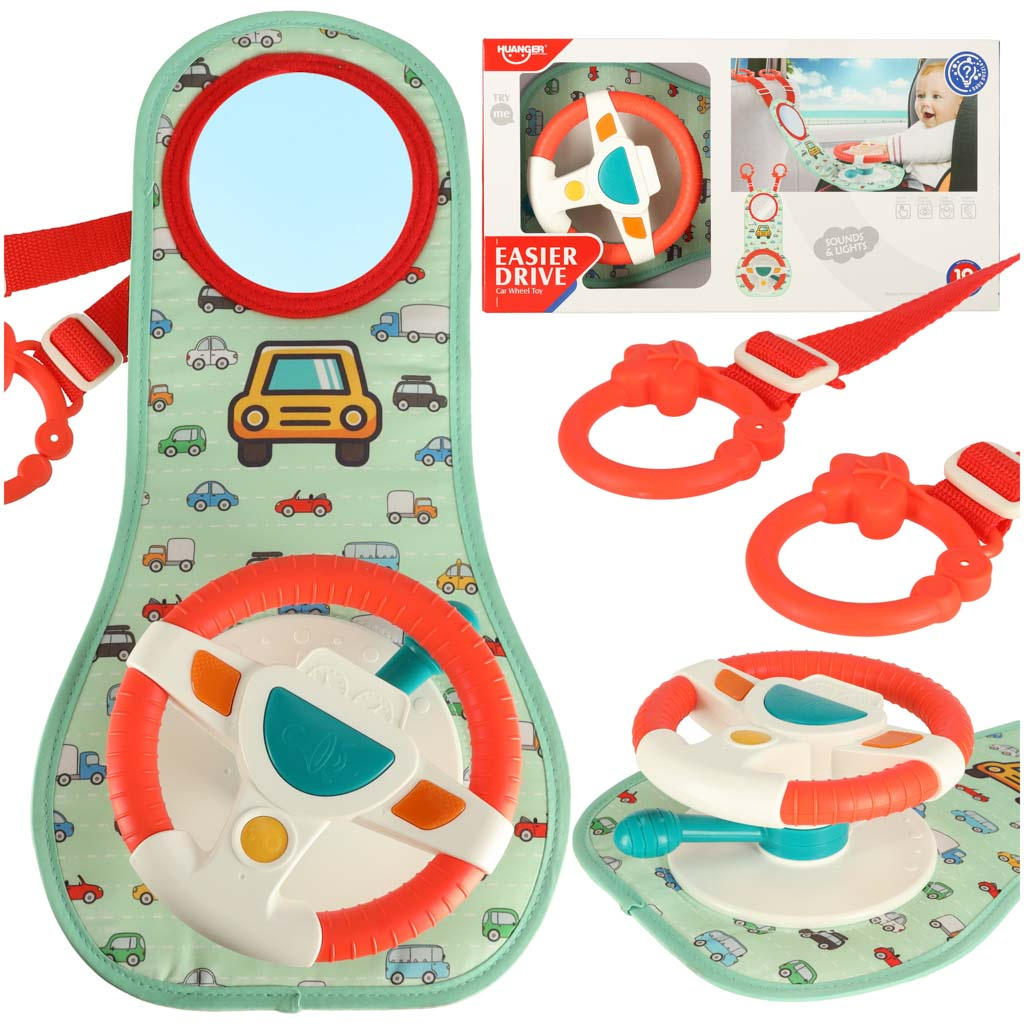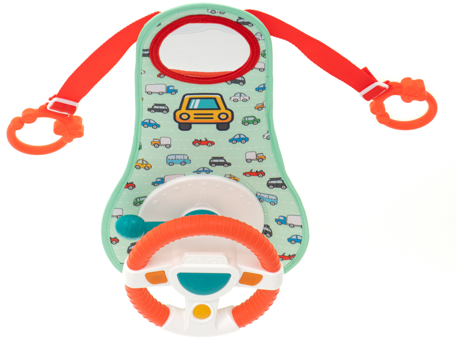 Ein aufgeregtes oder weinendes Kind auf dem Rücksitz ist für den Fahrer eine große Belastung. Wir haben eine Lösung, die die Reise Ihres Kleinkindes komfortabler macht und für eine reibungslose Fahrt sorgt.Das interaktive Lenkrad ist eine Art Manipulationsbrett, das die kleinen Hände während der gesamten Fahrzeit erfolgreich beschäftigt. Es besteht aus einem Lenkrad mit 4 Tasten, einem Sensorgriff und einemSicherheitsspiegel aus Kunststoff. die Stücke werden auf eine feste Matte gelegt, die mit einem angenehmen Stoff mit Automotiv überzogen ist.