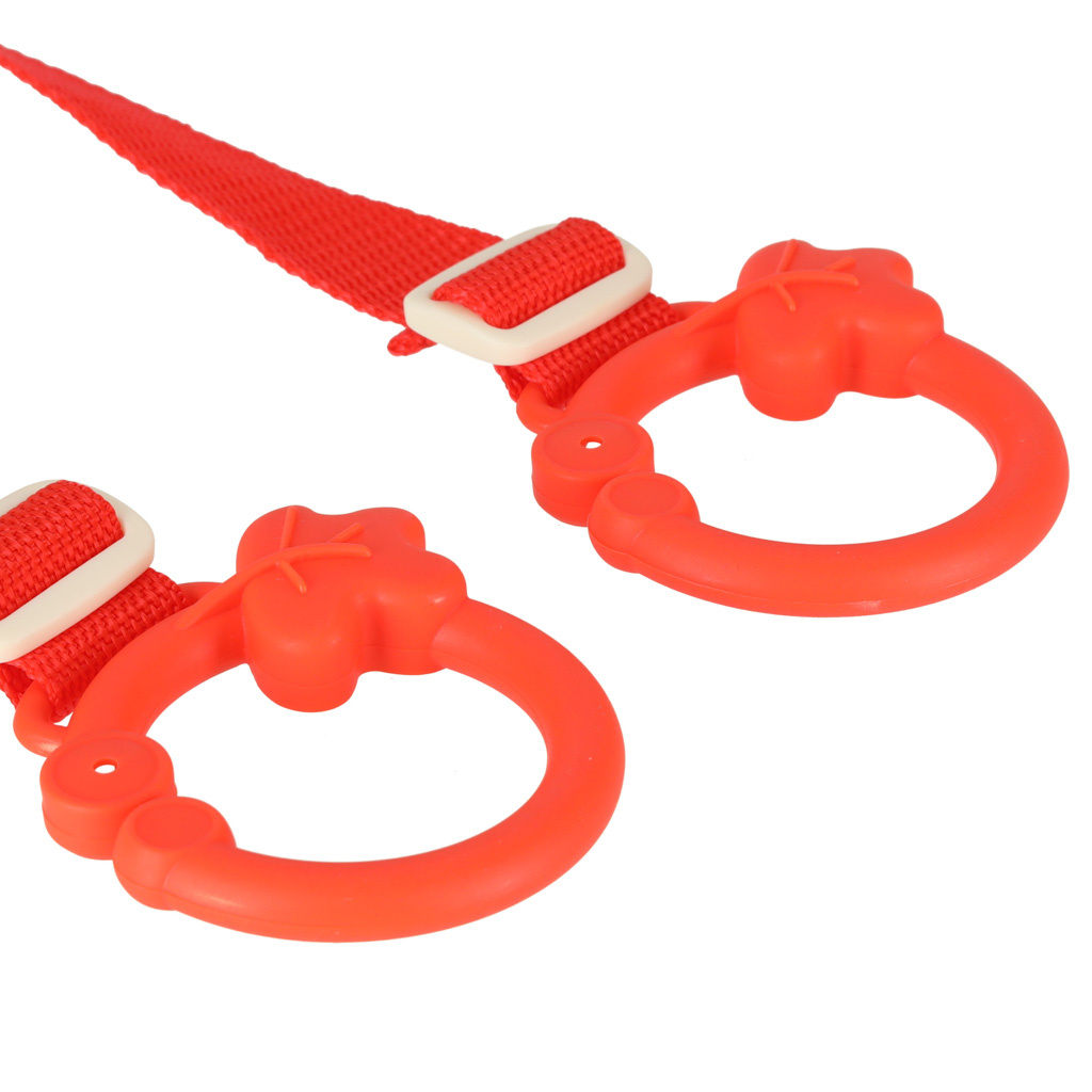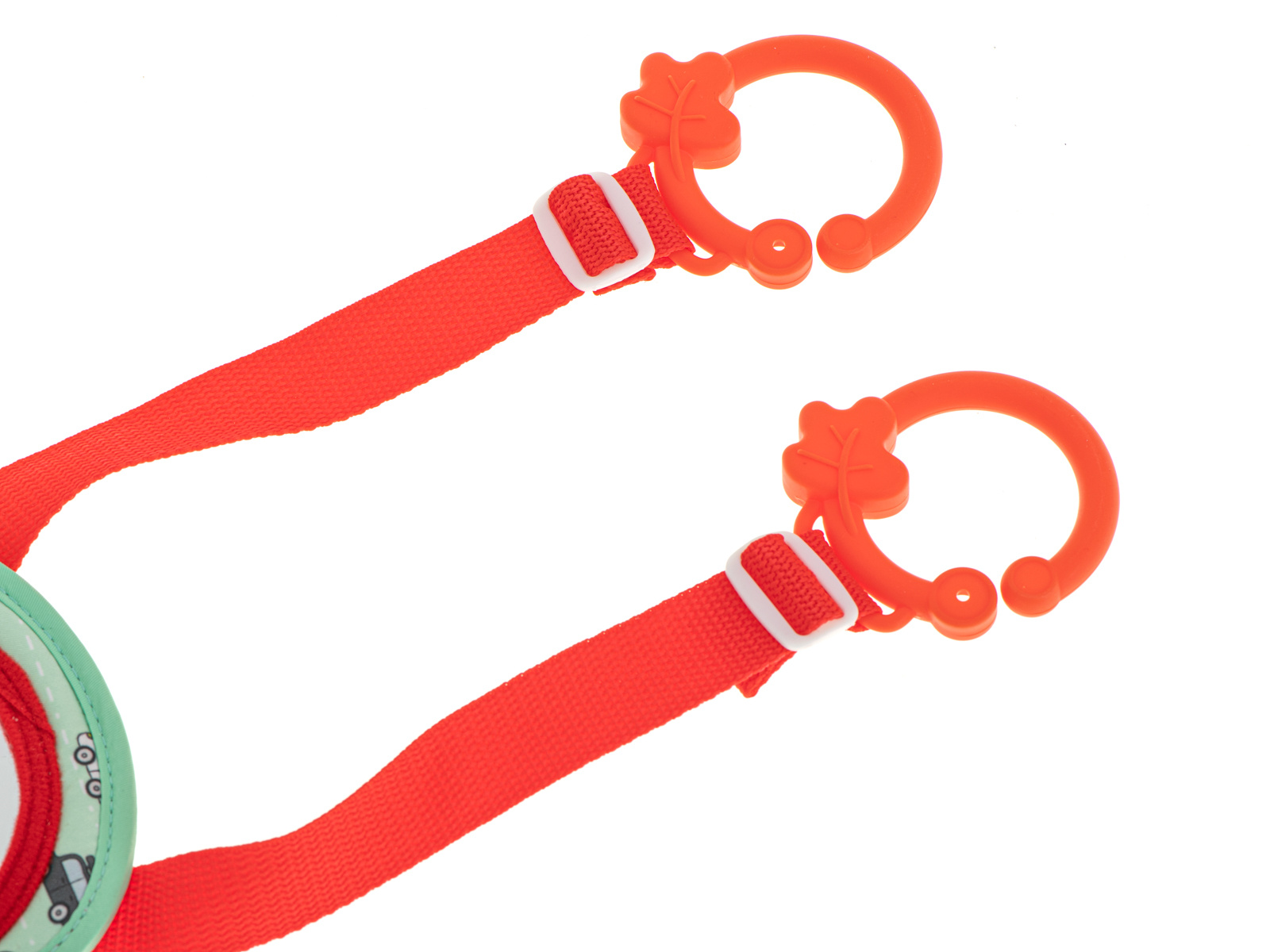 Das Spielzeug wird an den Kopfstützen der Vordersitze mit Kunststoffrädern an verstellbaren Bändern befestigt.
