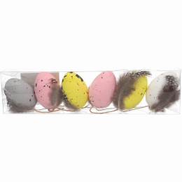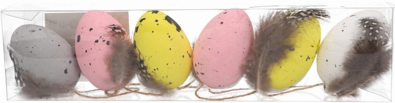 Dodaj wyjątkowego uroku swojej wielkanocnej aranżacji dzięki tym pięknym jajkom dekoracyjnym z piórkiem! Zestaw 6 sztuk to idealny sposób na ozdobienie stołu, koszyków wielkanocnych czy innych wiosennych dekoracji. Jajka z delikatnym piórkiem wprowadzą do Twojego domu subtelną elegancję i radosny, świąteczny nastrój.