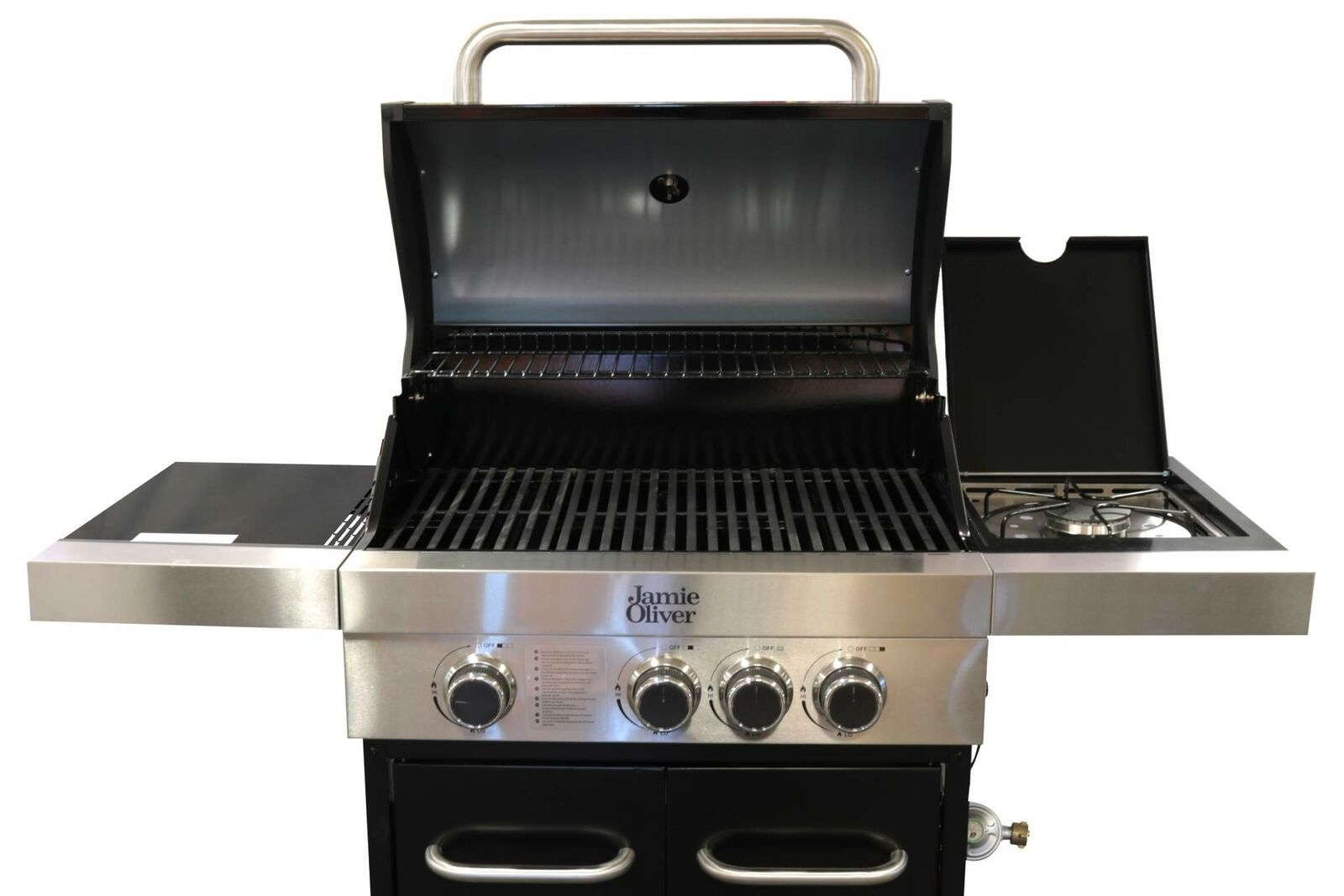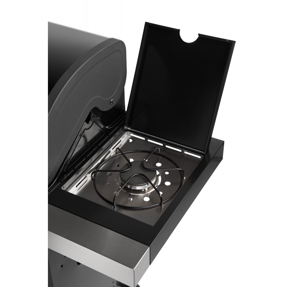 Der Grill ist außerdem mit einem eingebauten Seitenbrenner ausgestattet, der in die Arbeitsplatte integriert ist - so können Sie bequem Ihre Lieblingssaucen oder -beilagen zubereiten, während Sie grillen. Der praktische, abschließbare Deckel des Seitenbrenners kann im geschlossenen Zustand als Arbeits- oder Ablagefläche genutzt werden.