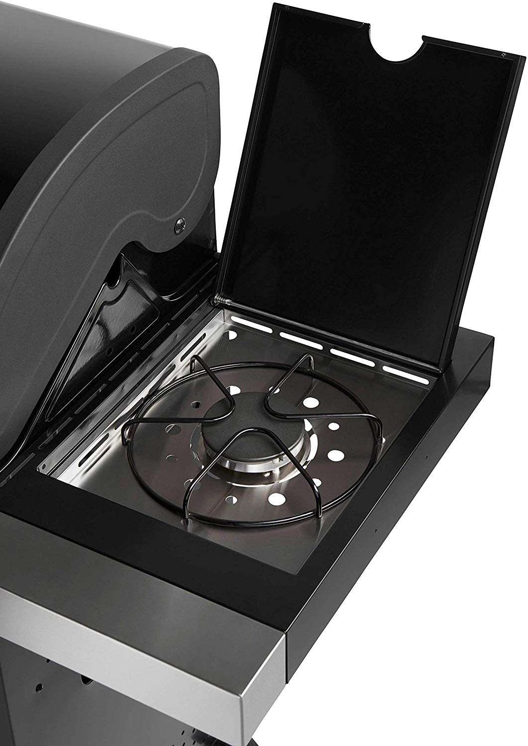 Die Röhrenbrenner haben eine Leistung von 14 kW, die völlig ausreicht, um alle Speisen bei jedem Wetter zu grillen. Massive Grillroste aus Gusseisen sorgen für eine gleichmäßigere Wärmeverteilung. DerHauptgrillplatz ist mit 4 Brennern mit separater Regelung ausgestattet. Der Grill ist außerdem mit einem eingebauten Seitenbrenner ausgestattet, der in die Arbeitsplatte integriert ist - so können Sie bequem Ihre Lieblingssaucen oder -beilagen zubereiten, während Sie grillen. Der praktische, abschließbare Deckel des Seitenbrenners kann im geschlossenen Zustand als Arbeits- oder Ablagefläche genutzt werden. Sehr praktisch ist das Hängeregal, in dem Sie Ihre bereits fertigen Gerichte warmhalten und verzehrfertig machen können.Der Grill ist ausgestattet mit einem praktischen scharnierdeckel mit eingebautem Thermometer