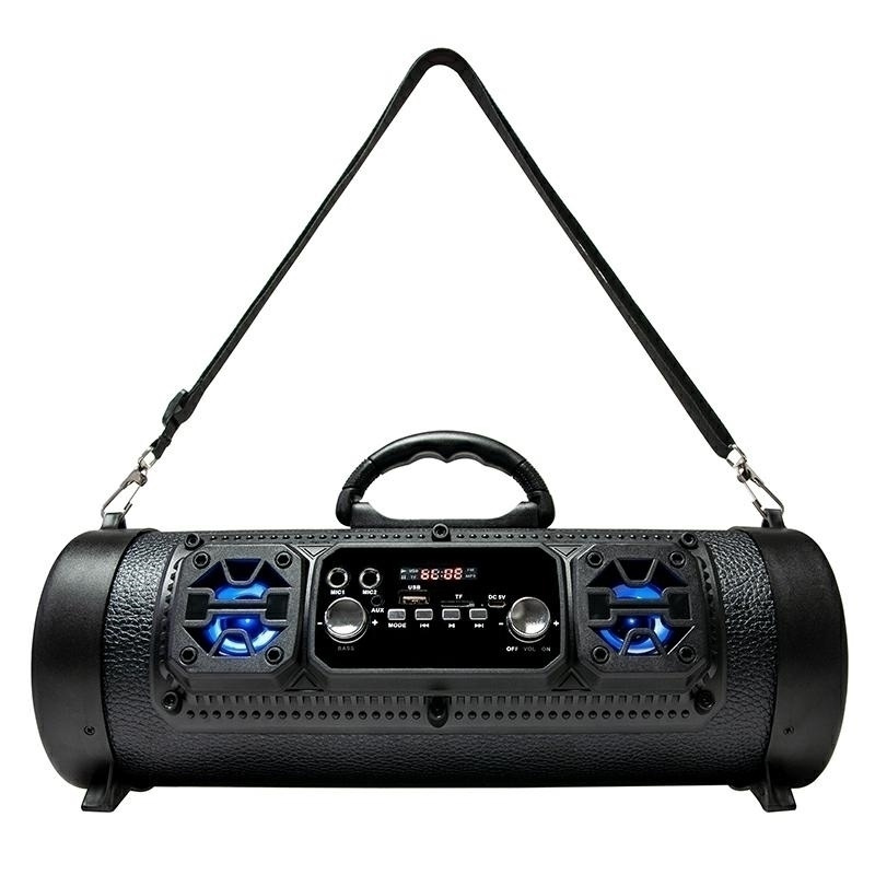 Głośnik bezprzewodowy Bluetooth z wbudowanym czytnikiem kart microSD, gniazdem USB do podłączenia nośnika zewnętrznego oraz wejściem AUX. Specyfikacja techniczna: zasilanie: wbudowany akumulator 1000mAh 2 wejścia mikrofonowe Jack 6,3mm moc: 2 głośniki wysokotonowe 3W + głośnik niskotonowy 5W wejście AUX miniJack 3,5mm czytnik kart microSD slot USB do podłączenia pendrive`a w zestawie kabel microUSB do ładowania wymiary: 37,5x15,5x15cm pasek na ramię w zestawie ilość szt. w kartonie: 20