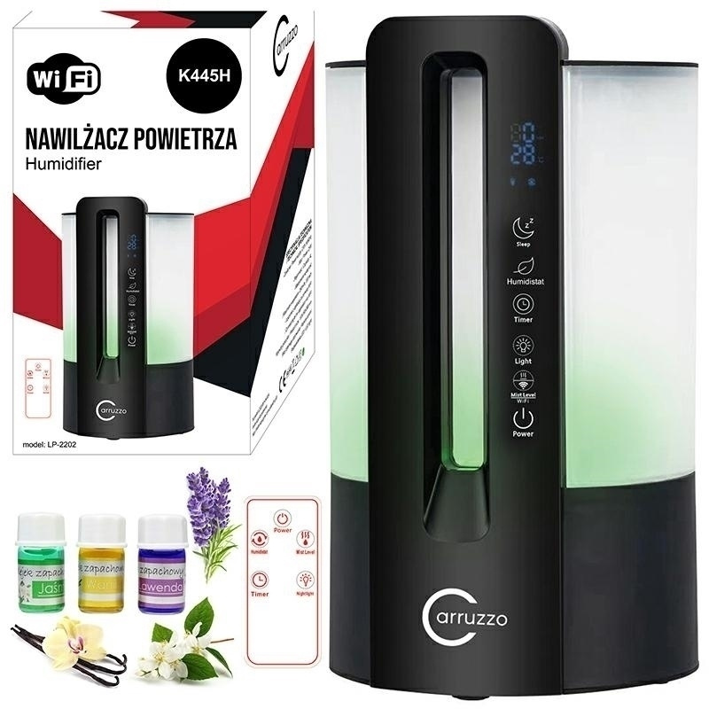 Wysuszone śluzówki, łzawiące oczy, problemy ze skórą, gardłem i drogami oddechowymi to podstawowe dolegliwości mogące być wynikiem przebywania w pomieszczeniach, w których poziom wilgotności nie przekracza 30%. Ultradźwiękowy nawilżacz powietrza, działający na zasadzie fal ultradźwiękowych, zmienia czystą wodę w chłodną i orzeźwiającą parę, wytwarzając przy tym znaczne ilości jonów ujemnych, wytrącających pyłki, kurz i inne zanieczyszczenia powietrza. Urządzenie o niewielkim zużyciu energii. Dzięki specjalnej aplikacji - urządzenie łączy się ze smartfonem pracującym pod kontrolą systemu Android lub iOS. Po sparowaniu istnieje możliwość dodania urządzenia do domowego systemu smart home i sterowania nawilżaczem przez asystenta głosowego, programowanie schematów działania itp. Marka: Carruzzo Specyfikacja: lampka nocna łączność wi-fi - możliwość sterowania urządzeniem za pomocą smartfona ze specjalną aplikacją pojemność zbiornika: 4l wydajność: 300ml/h pilot zdalnego sterowania funkcja aromaterapii - możliwość dodania olejku do specjalnego dozownika wewnątrz zbiornika tryb nocny filtr ceramiczny w zestawie regulacja ilości emitowanej mgiełki (3 poziomy) ochrona urządzenia przez uszkodzeniem w wyniku braku wody dotykowy ekran higrostat - konfiguracja wilgotności w zakresie 40 do 90 RH% termometr timer 1-8h moc: 25W zasilanie: 230V 50Hz wymiary: 34x19,5x19,5cm 3 olejki zapachowe (lawenda, wanilia, jaśmin) GRATIS! wymiary opakowania: 20x20x36cm Ilość szt. na palecie: 114