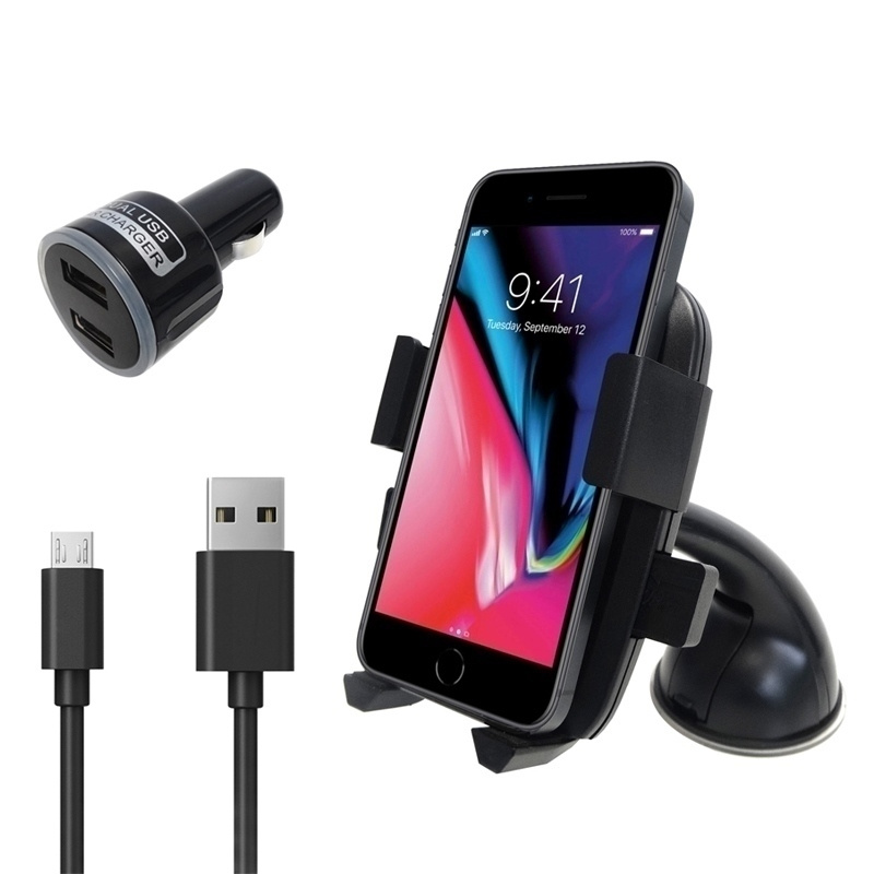 Wysokiej jakości uniwersalny zestaw GSM - uchwyt samochodowy na telefon + ładowarka z kablem microUSB 2x usb 2A. Uniwersalność zestawu gwarantowana, pasuje do większości modeli tel(4”-5,7”) dostępnych na rynku. Cechy produktu: - uchwyt zaprojektowany specjalnie dla smartfonów 4"-5.7" - regulacja uchwytu 360o - materiał: wysokiej jakości wytrzymałe tworzywo sztuczne - napięcie wejściowe: 12V - napięcie wyjściowe: 5V - prąd wyjściowy: 2,1A - kabel microUSB długość: ok.100cm