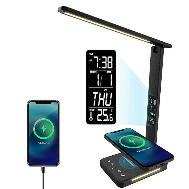 Lampka biurkowa z ładowarką indukcyjną termometrem, zegarem, kalendarzem oraz budzikiem. Urządzenie jest energooszczędne dzięki zastosowaniu źródła światła LED. Lampka posiada regulację kąta nachylenia oraz możliwość obracania, dzięki czemu łatwo dostosować światło do naszych potrzeb. Urządzenie idealnie sprawdzi się podczas czytania, odrabiania lekcji i pracy. wymiary opakowania: 37x14x6cm Specyfikacja: moc całkowita: 18W ładowanie indukcyjne Qi 10W ładowanie z gniazda USB (5V 2.1A) lampka nocna (3 tryby świecenia) budzik z funkcją drzemki kalendarz z dniami tygodnia termometr zegar, kalendarz, termometr, budzik posiadają podtrzymanie zasilania przy pomocy baterii CR2032 (w zestawie) podświetlenie ekranu zasilanie lampki: zasilacz sieciowy :wejście: 100-240V 50/60Hz, wyjście: 12V 1.5A dł. przewodu zasilającego: 145cm 5 poziomów jasności 5 barw światła strumień świetlny: 500lm wymiary: wys./szer./gł.: 36cm/11,7cm/30,3cm 2 uchwyty na telefon lampka wykonana z tworzywa sztucznego o fakturze skóry