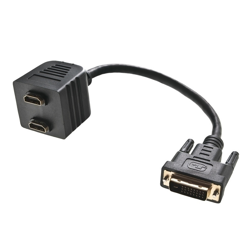 DVI adapter z kablem o długości około 20 cm i pozłacanych złączach, pozwala na podłączenie dwóch urządzeń HDMI.