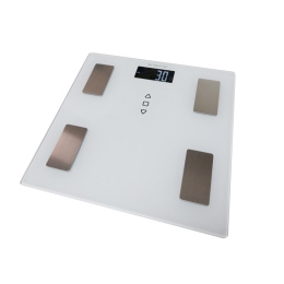 Waga łazienkowa umożliwiająca pomiary wody i tłuszczu w tkance mięśniowej i kostnej. Oblicza również dzienne zapotrzebowanie kalorii i wylicza BMI. Waga dokonuje pomiarów na podstawie wzrostu, wagi, wieku itp. Cechy: -wykonana z bezpiecznego szkła hartowanego -4 wysokiej jakości sensory tensometryczne -wyświetlacz LCD -panel dotykowy -pomiar:wagi, tkanki tłuszczowej i mięśniowej, BMI, zapotrzebowania kalorycznego, poziomu wody w organiźmie -automatyczne wyłączanie -wskaźnik przeładowan